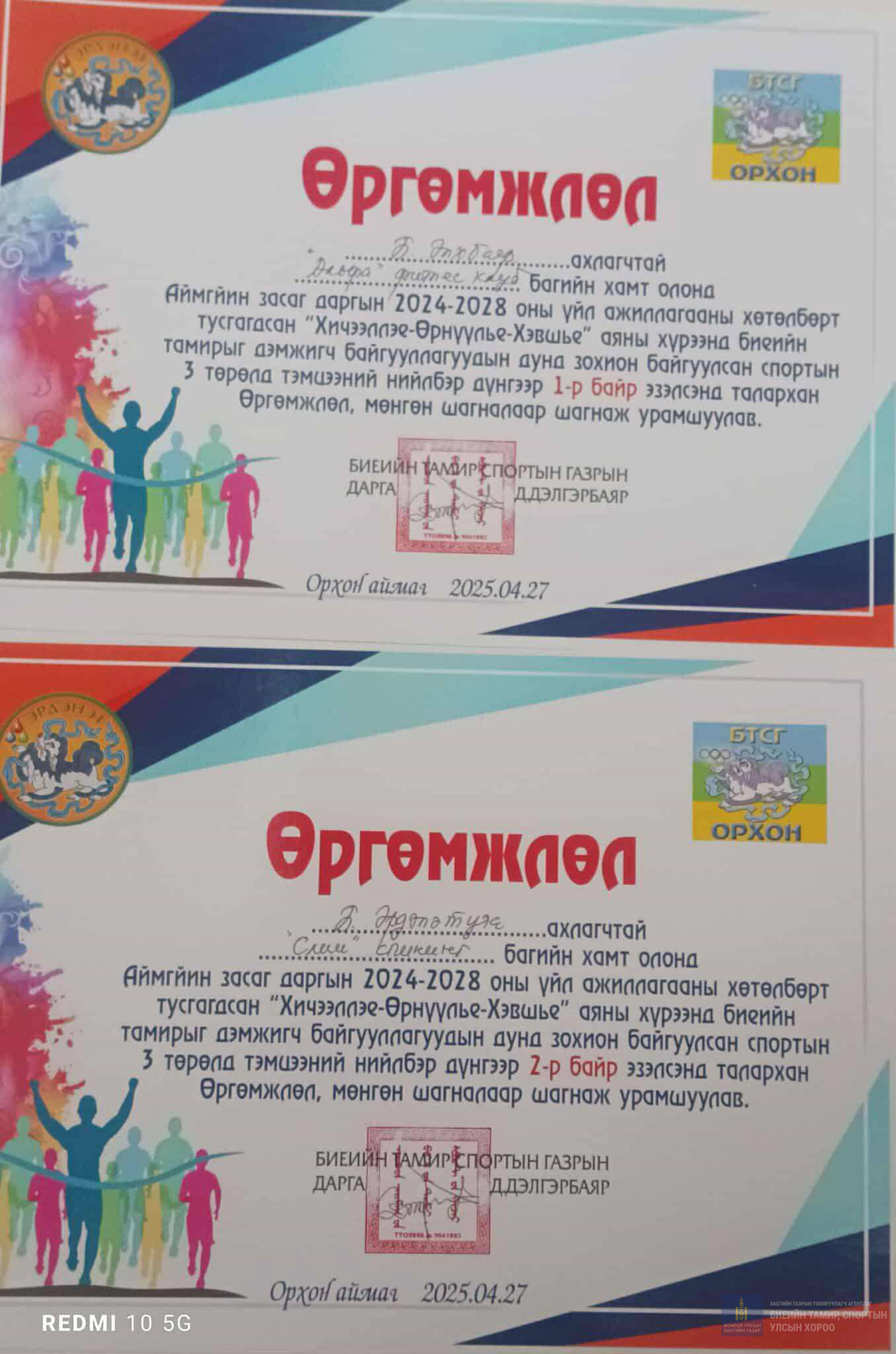 2-р байр Б.Эрдэнэтуяа захиралтай Слим спиннинг клубын баг тамирчид эзэлж Өргөмжлөл, мөнгөн шагнал хүртсэн.