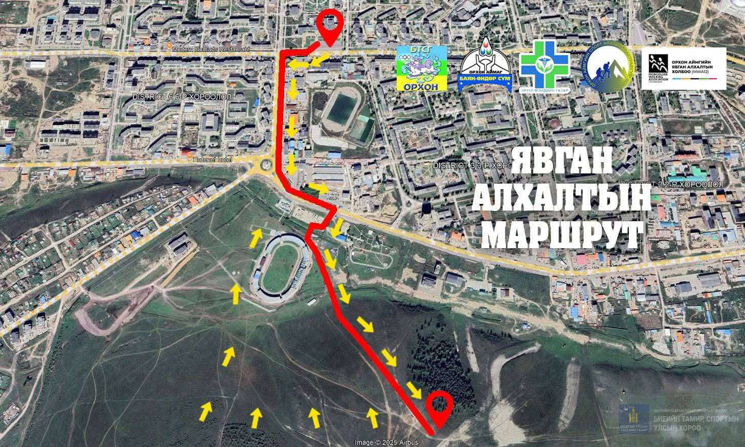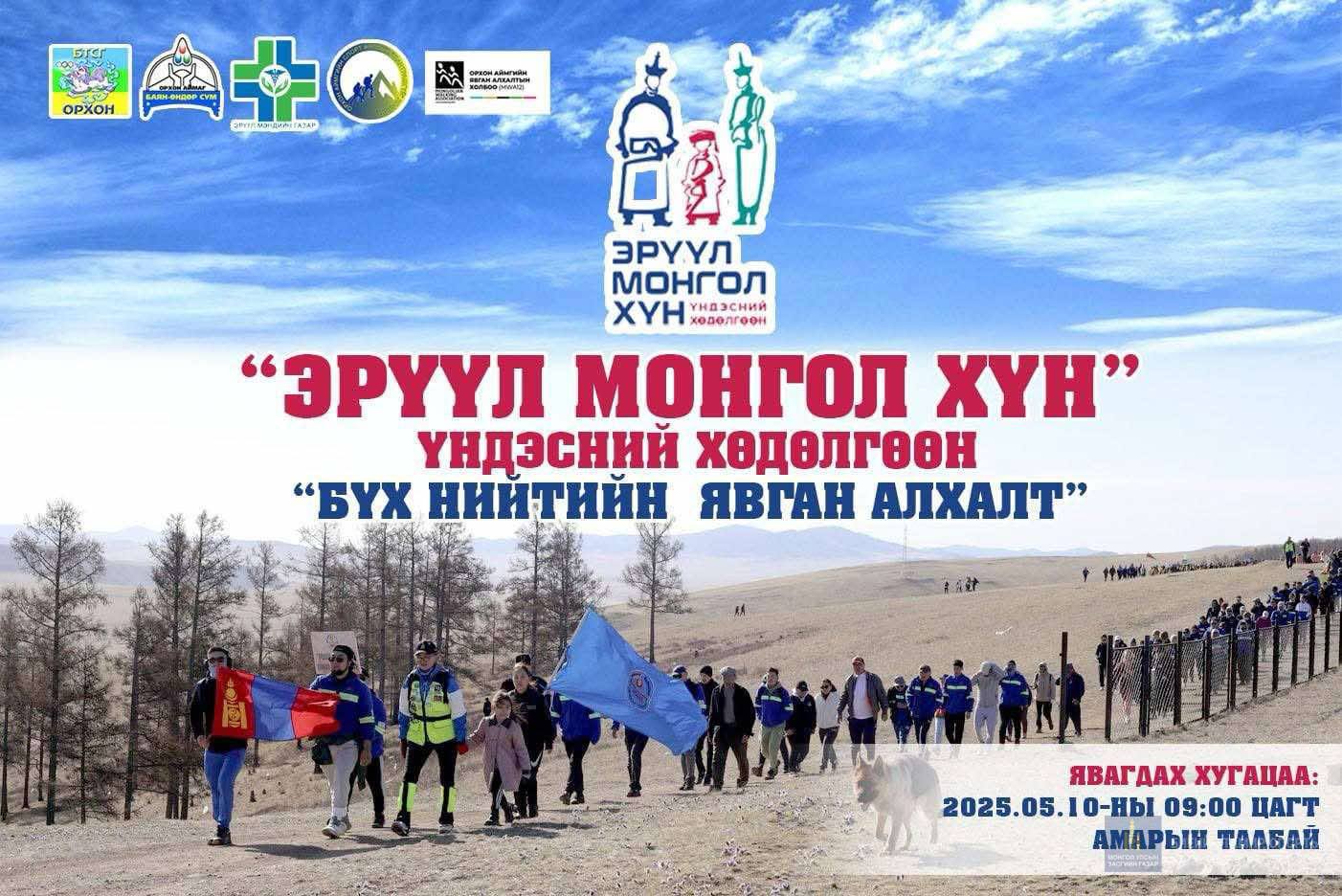 Монгол Улсын Ерөнхийлөгчийн санаачилгаар хэрэгжүүлж буй "Эрүүл Монгол Хүн" үндэсний хөдөлгөөний хүрээнд "Бүх нийтийн явган алхалт"-ын арга хэмжээг 2025 оны 05 дугаар сарын 10-ны өдрийн 09:00-11:00 цагт А.Амарын талбайгаас Сархиа-Уулын чиглэлд зохион байгуулах тул иргэд та бүхнийг гэр бүл, найз нөхөд, ажлын хамт олноороо тус алхалтад нэгдэхийг урьж байна.