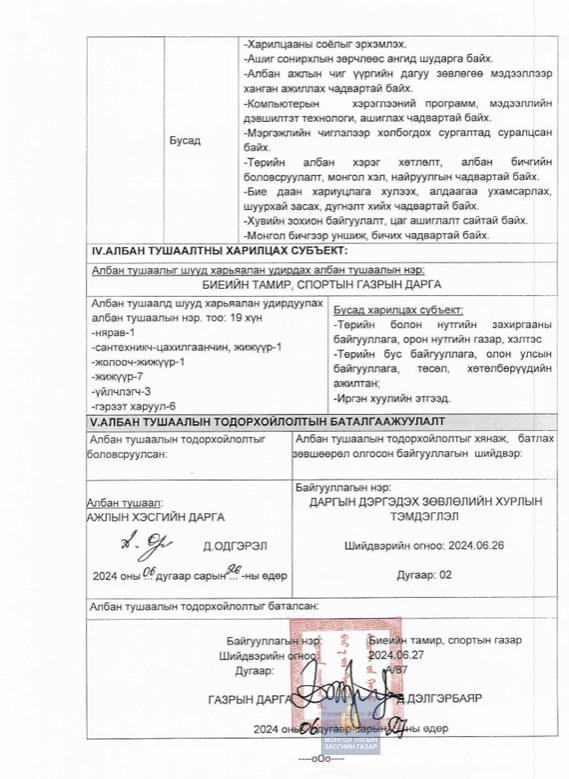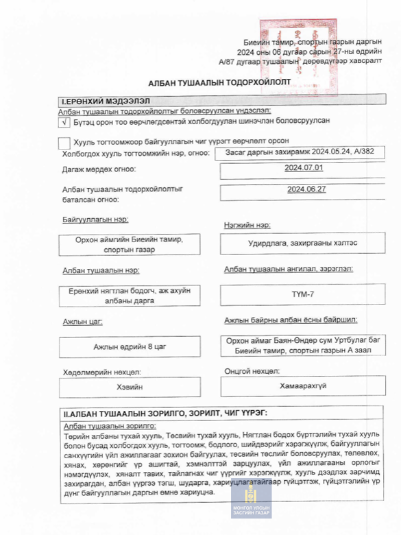 Орхон аймгийнБиеийн тамир, спортынгазрын даргын 2024 оны 06 дугаарсарын 27-ний өдрийн А/87дугаар тушаал;