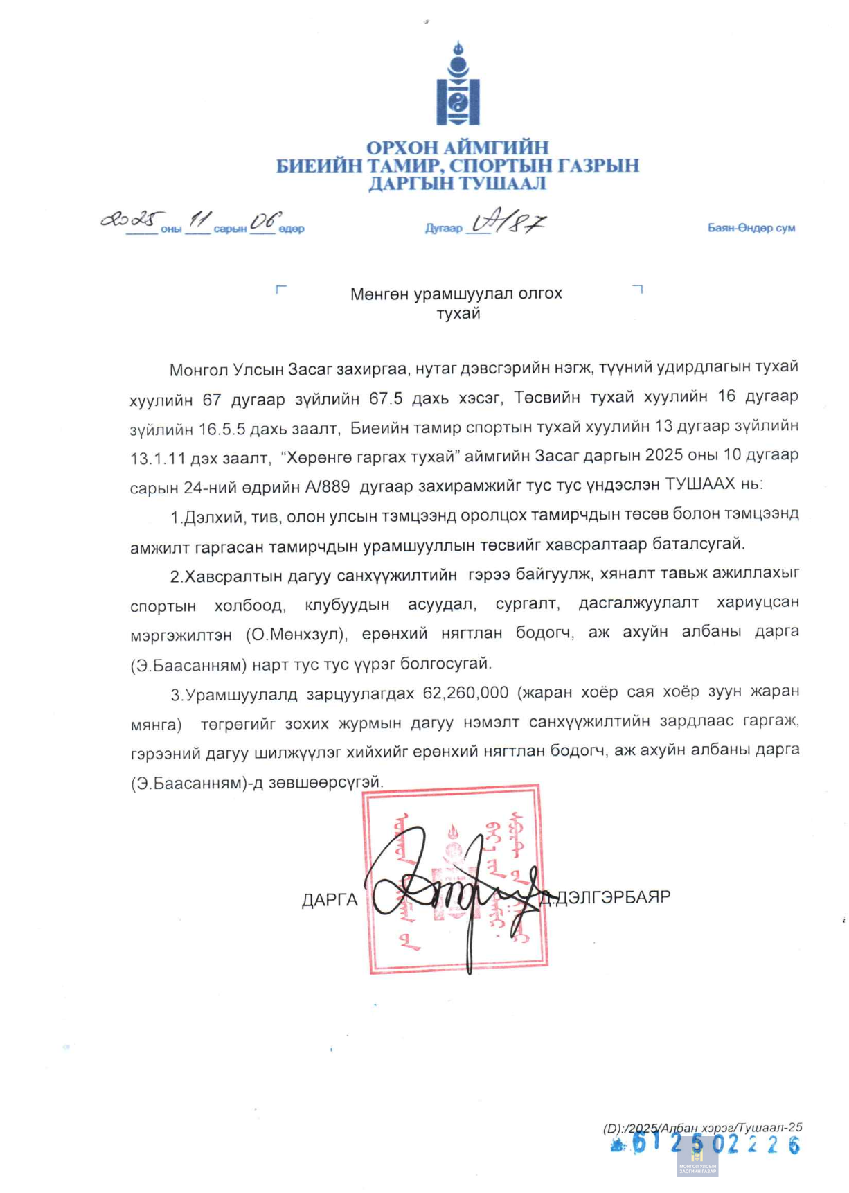 Даргын тушаал А/87