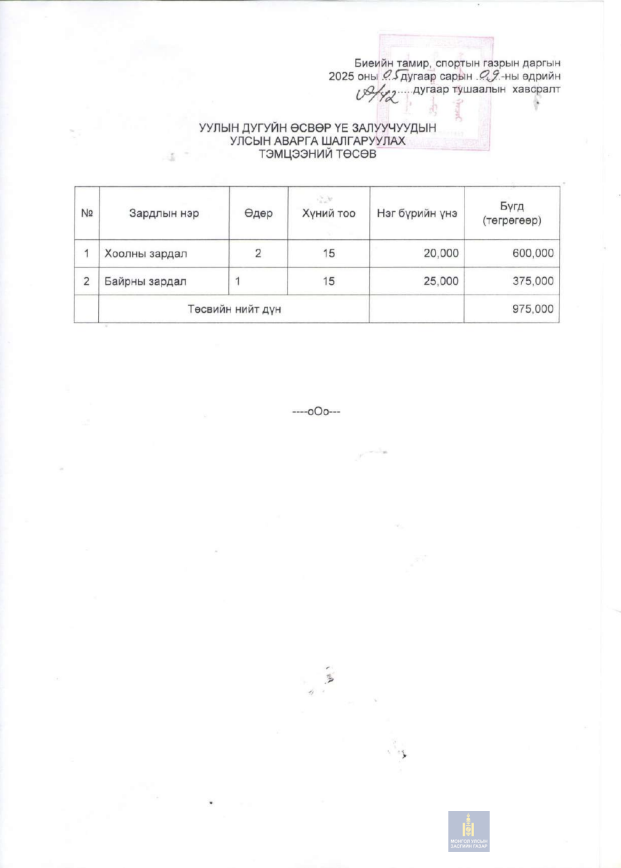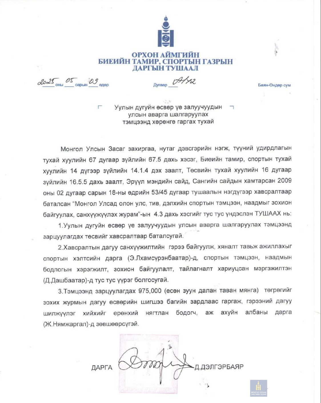 БИЕИЙН ТАМИР, СПОРТЫН ГАЗРЫН ДАРГЫН ТУШААЛ