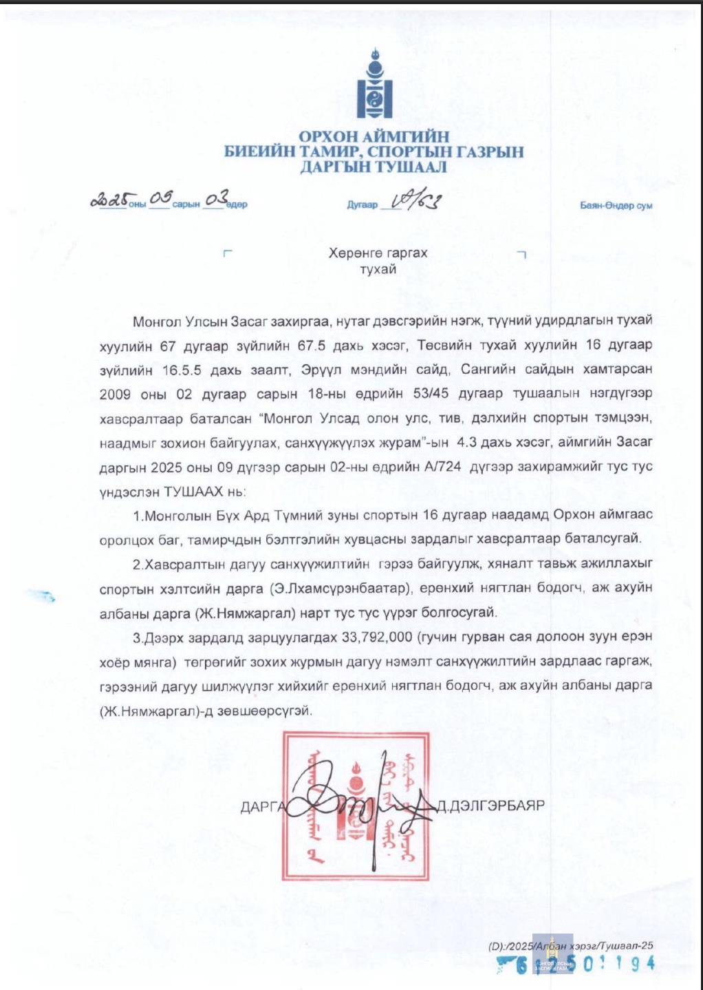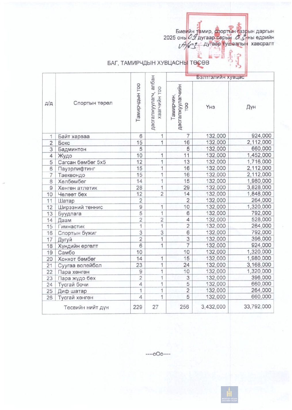 БИЕИЙН ТАМИР, СПОРТЫН ГАЗРЫН ДАРГЫН ТУШААЛ