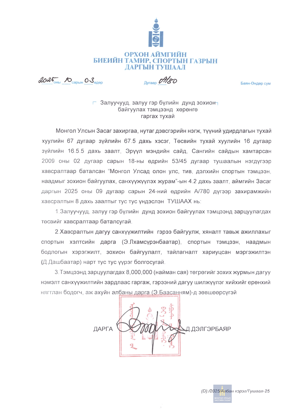 Даргын тушаал А/80