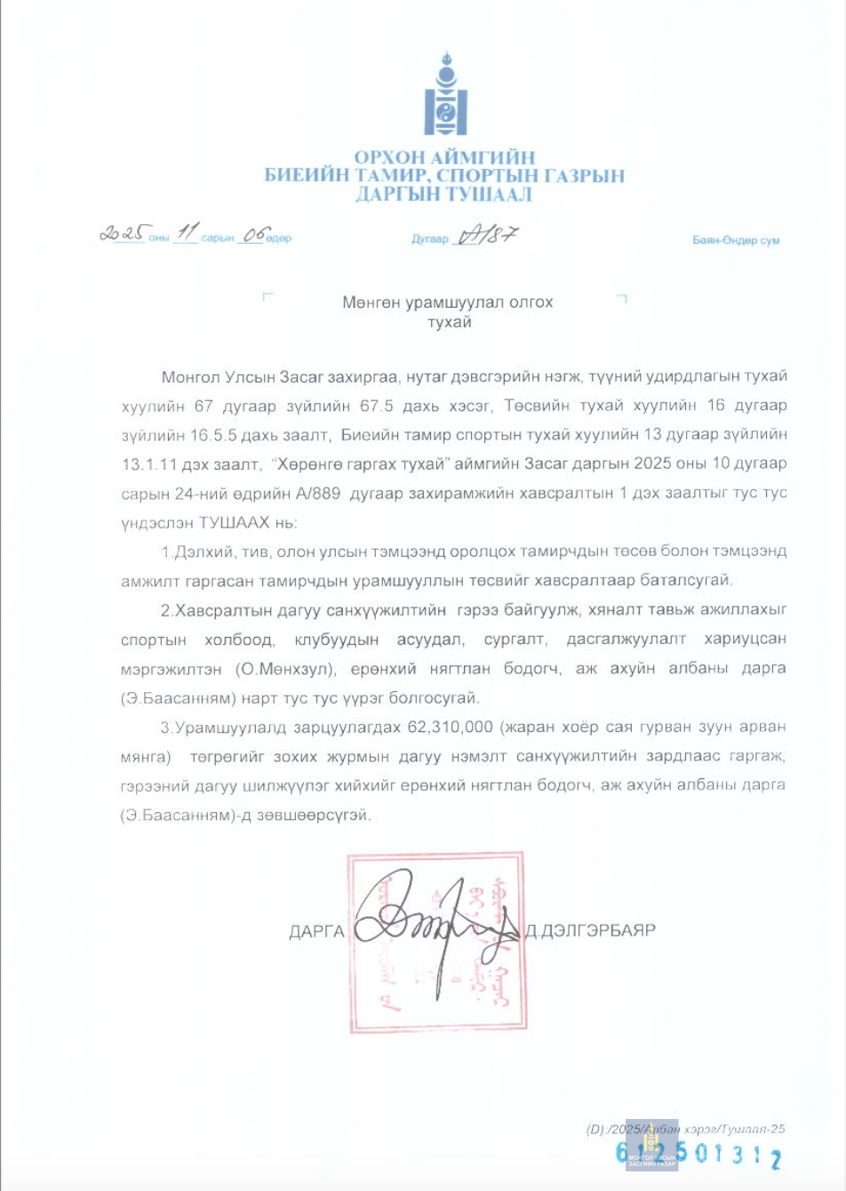 БИЕИЙН ТАМИР, СПОРТЫН ГАЗРЫН ДАРГЫН ТУШААЛ