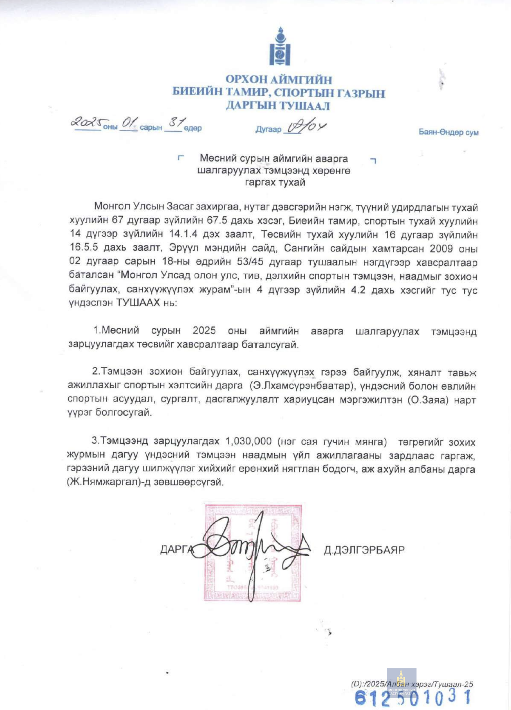 БИЕИЙН ТАМИР, СПОРТЫН ГАЗРЫН ДАРГЫН ТУШААЛ