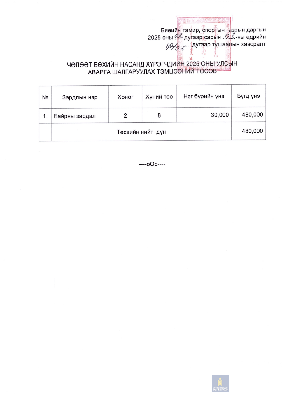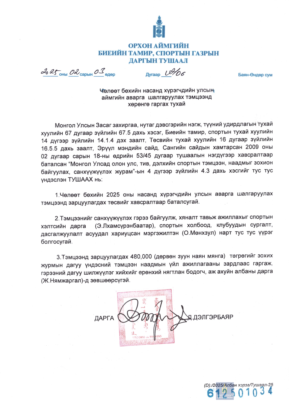 БИЕИЙН ТАМИР, СПОРТЫН ГАЗРЫН ДАРГЫН ТУШААЛ