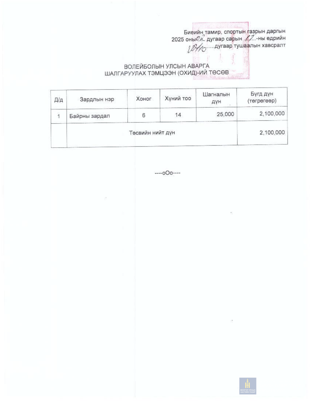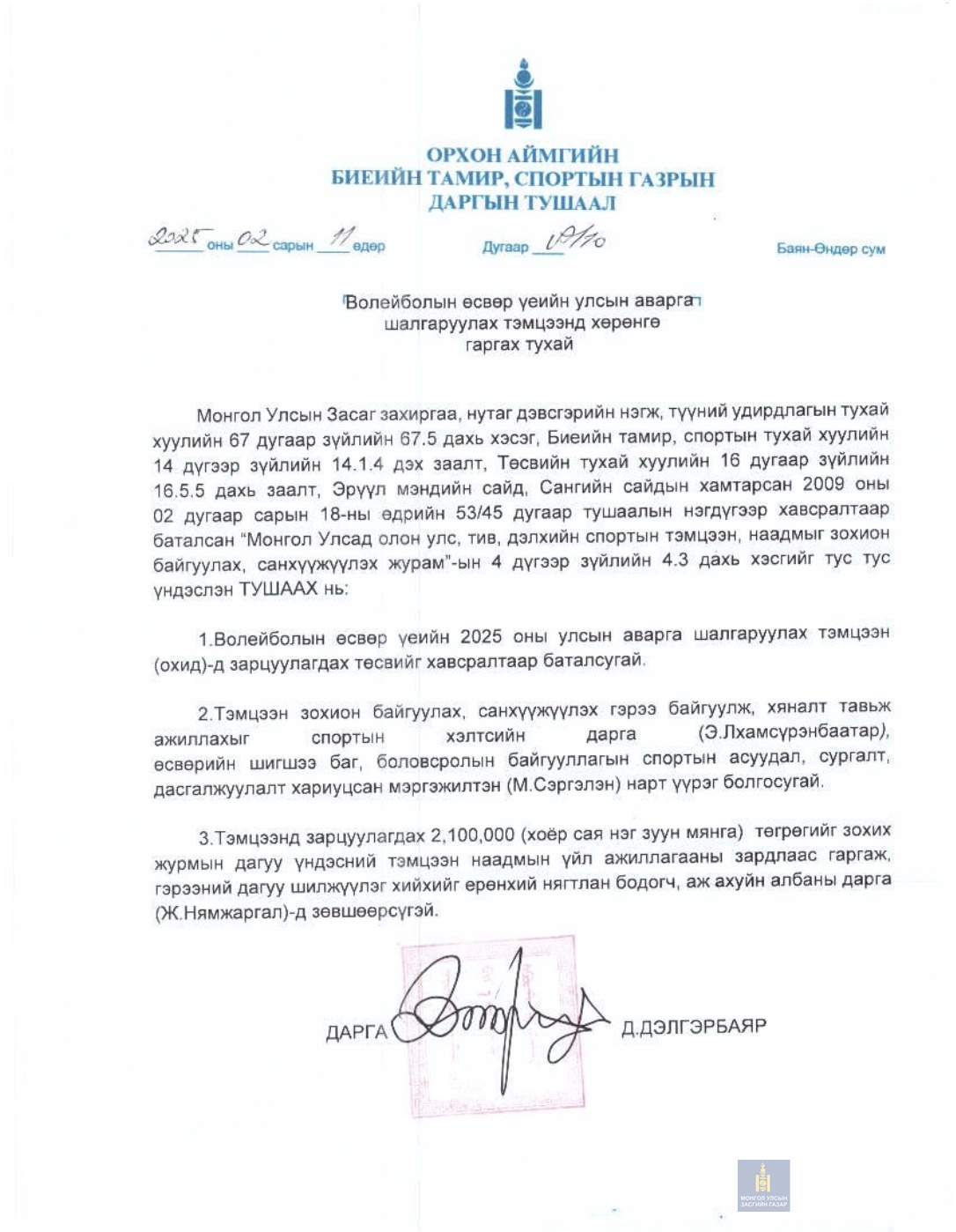 БИЕИЙН ТАМИР, СПОРТЫН ГАЗРЫН ДАРГЫН ТУШААЛ