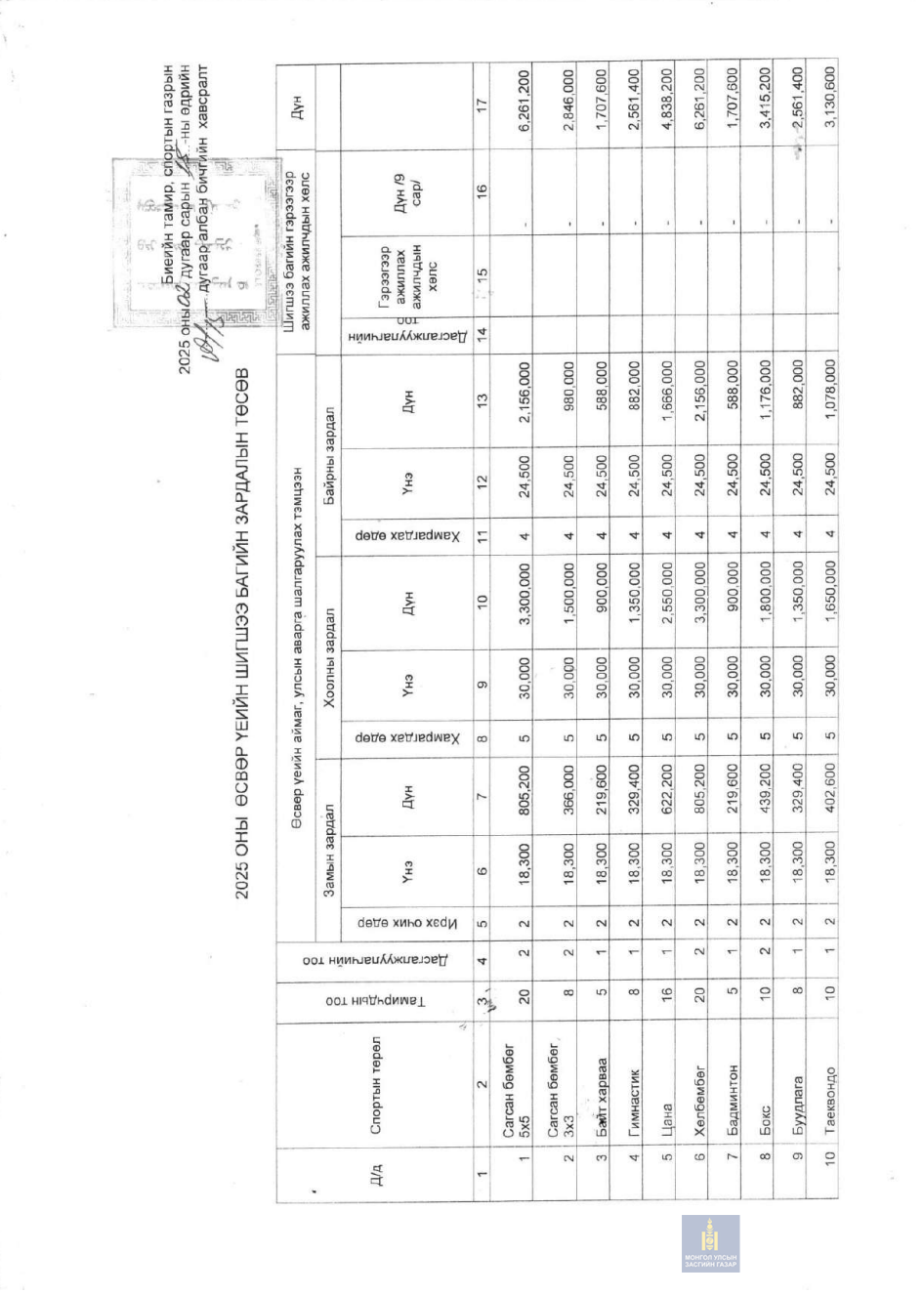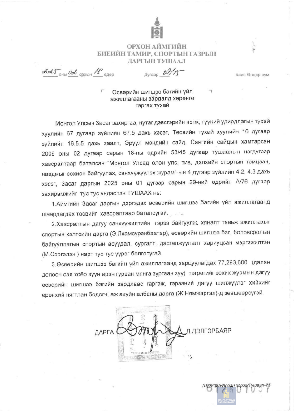 БИЕИЙН ТАМИР, СПОРТЫН ГАЗРЫН ДАРГЫН ТУШААЛ