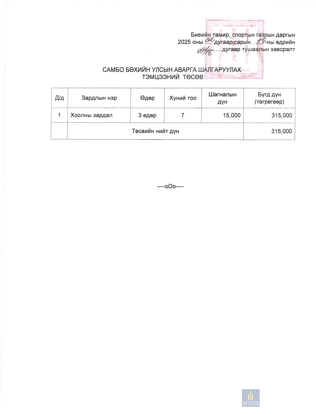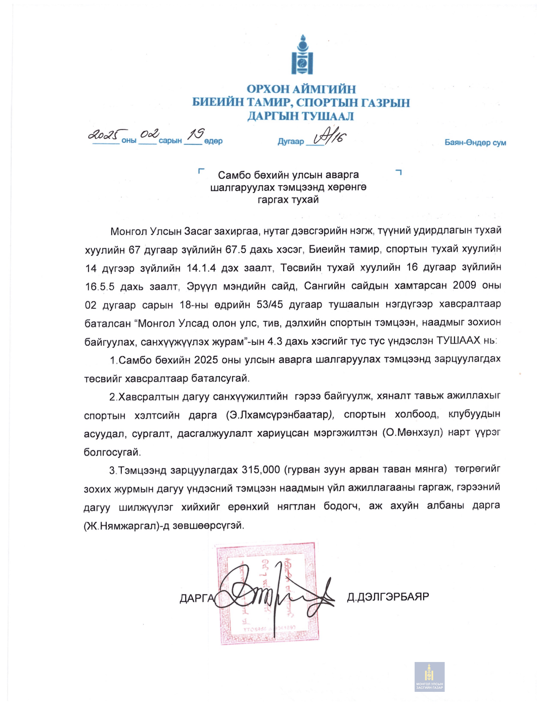 БИЕИЙН ТАМИР, СПОРТЫН ГАЗРЫН ДАРГЫН ТУШААЛ