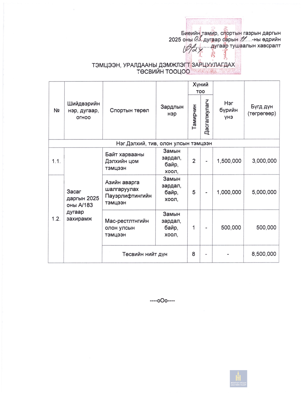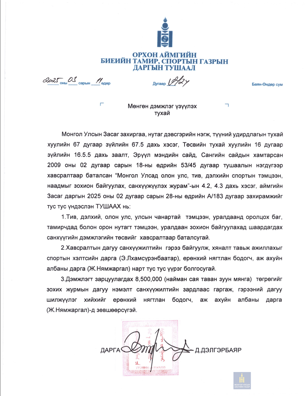 БИЕИЙН ТАМИР, СПОРТЫН ГАЗРЫН ДАРГЫН ТУШААЛ