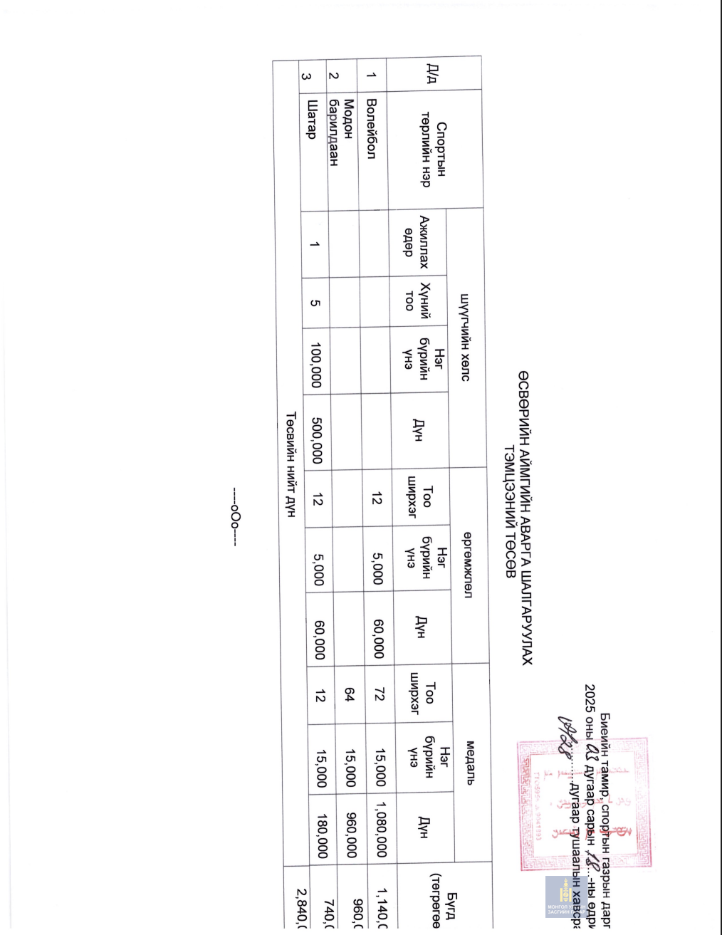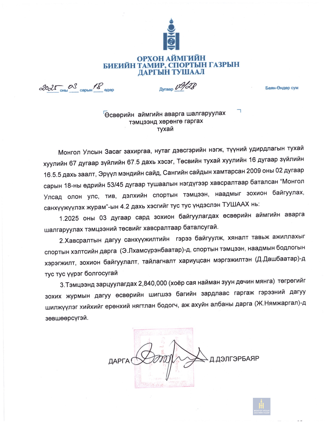 БИЕИЙН ТАМИР, СПОРТЫН ГАЗРЫН ДАРГЫН ТУШААЛ