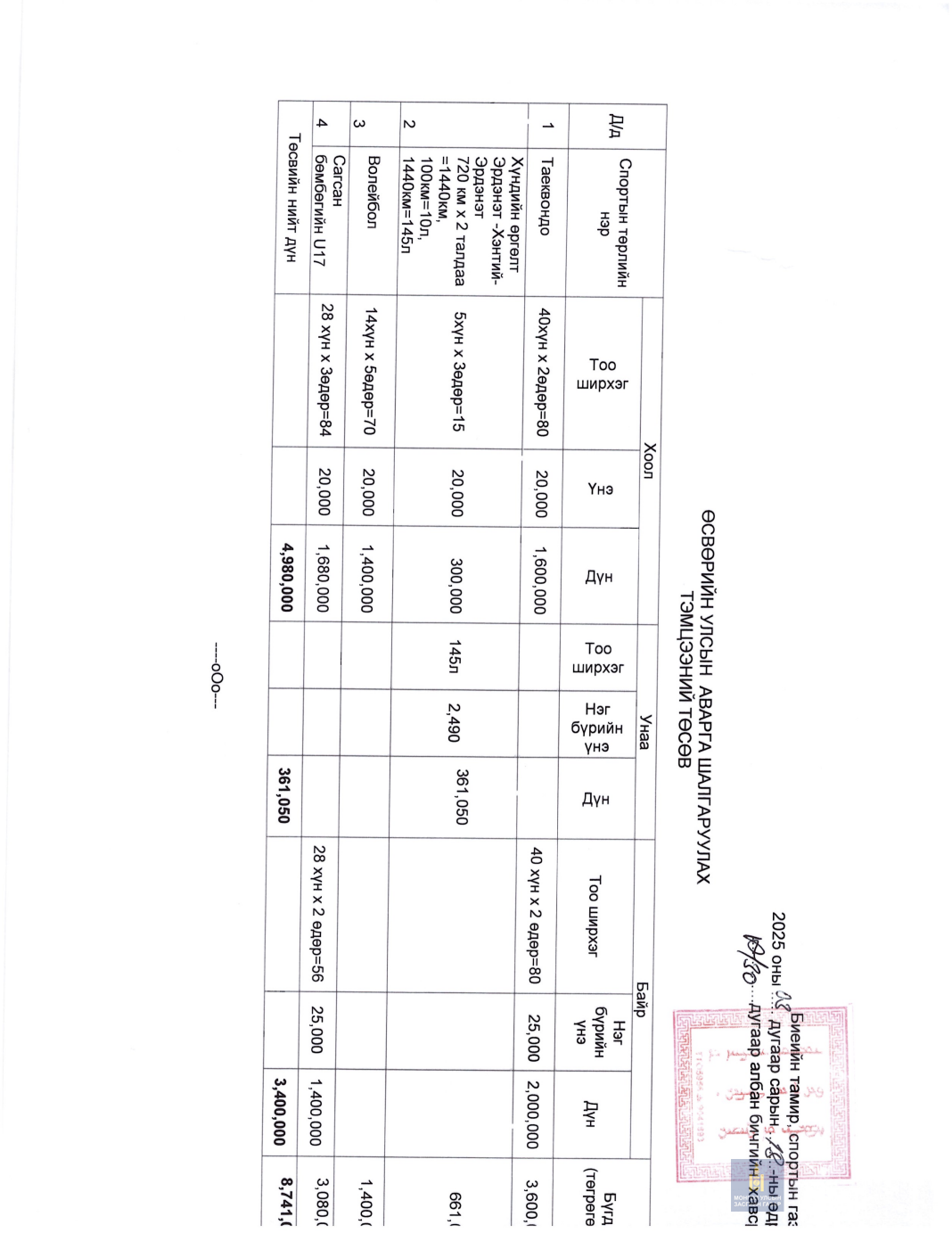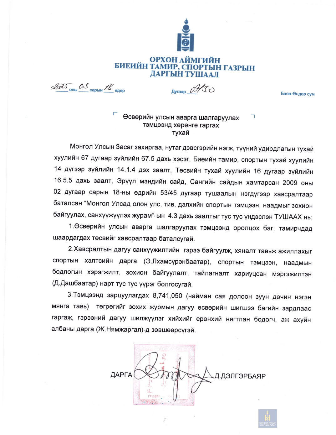 БИЕИЙН ТАМИР, СПОРТЫН ГАЗРЫН ДАРГЫН ТУШААЛ