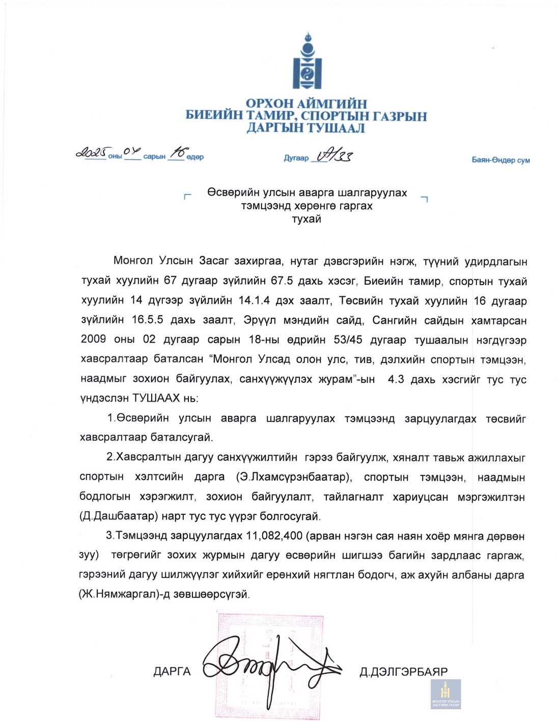БИЕИЙН ТАМИР, СПОРТЫН ГАЗРЫН ДАРГЫН ТУШААЛ
