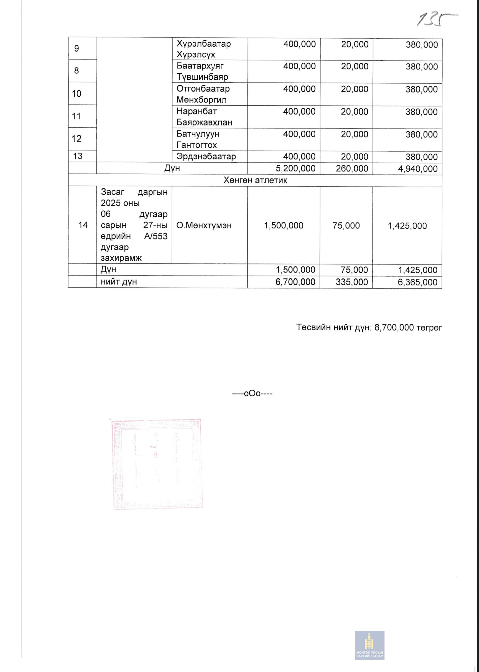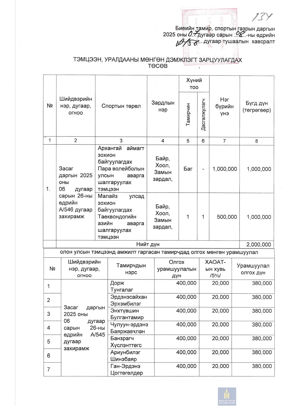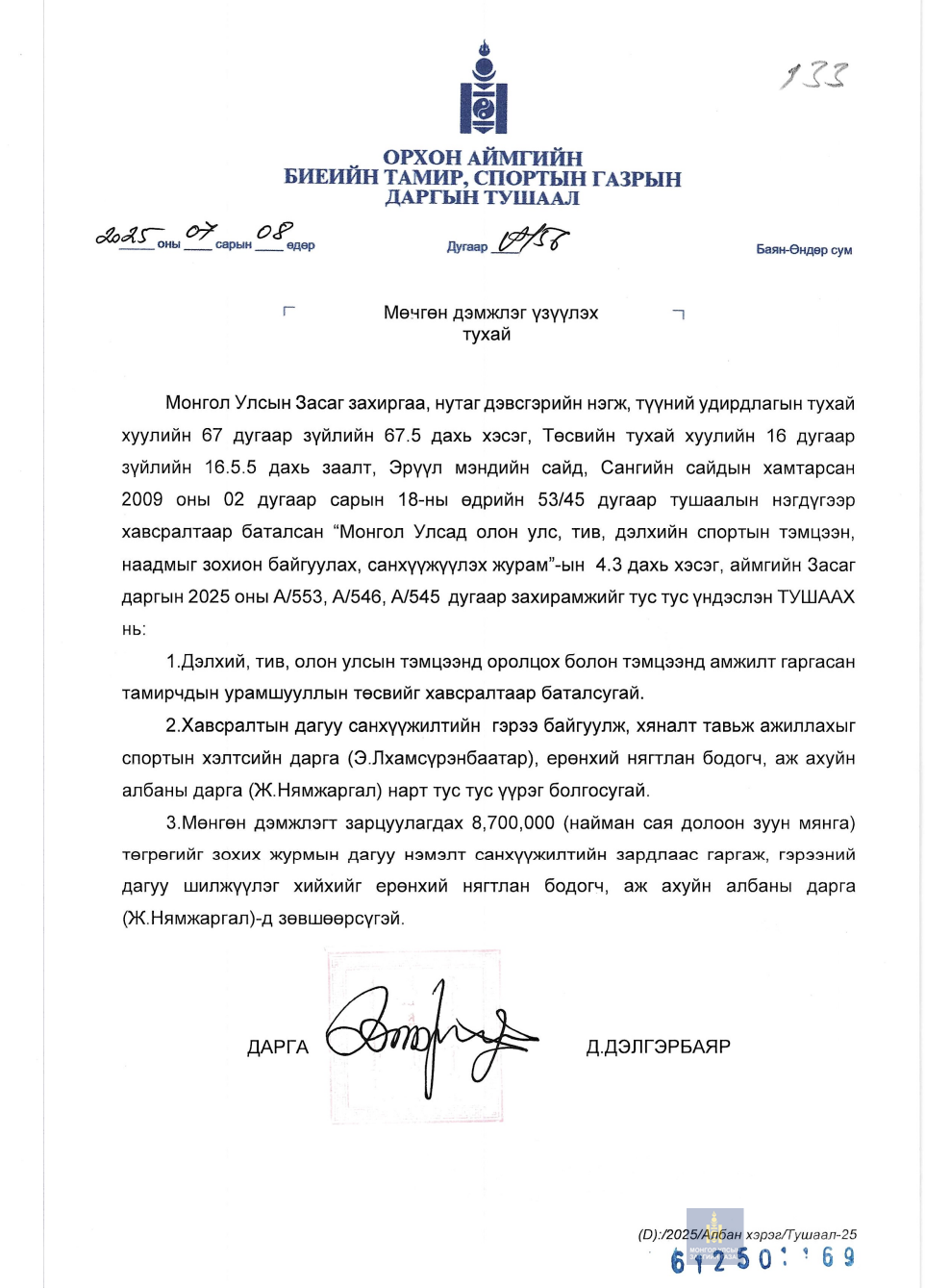 БИЕИЙН ТАМИР, СПОРТЫН ГАЗРЫН ДАРГЫН ТУШААЛ