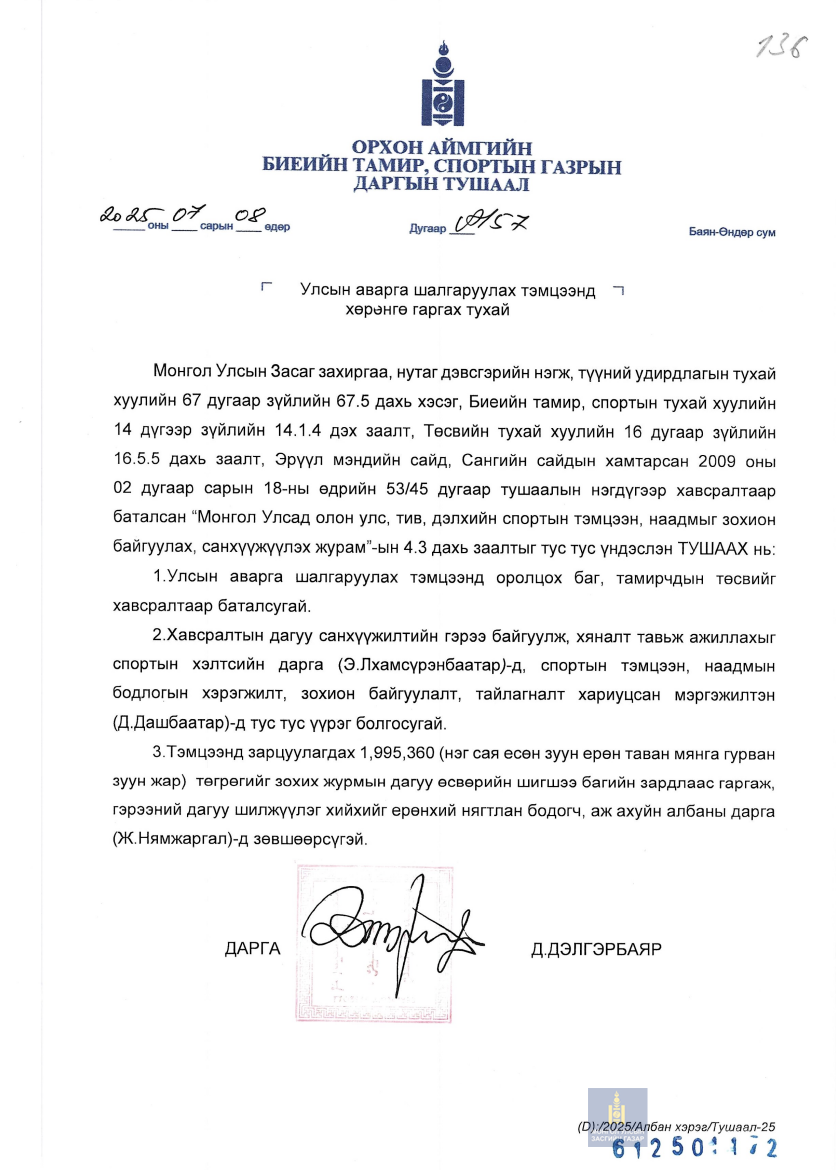 БИЕИЙН ТАМИР, СПОРТЫН ГАЗРЫН ДАРГЫН ТУШААЛ
