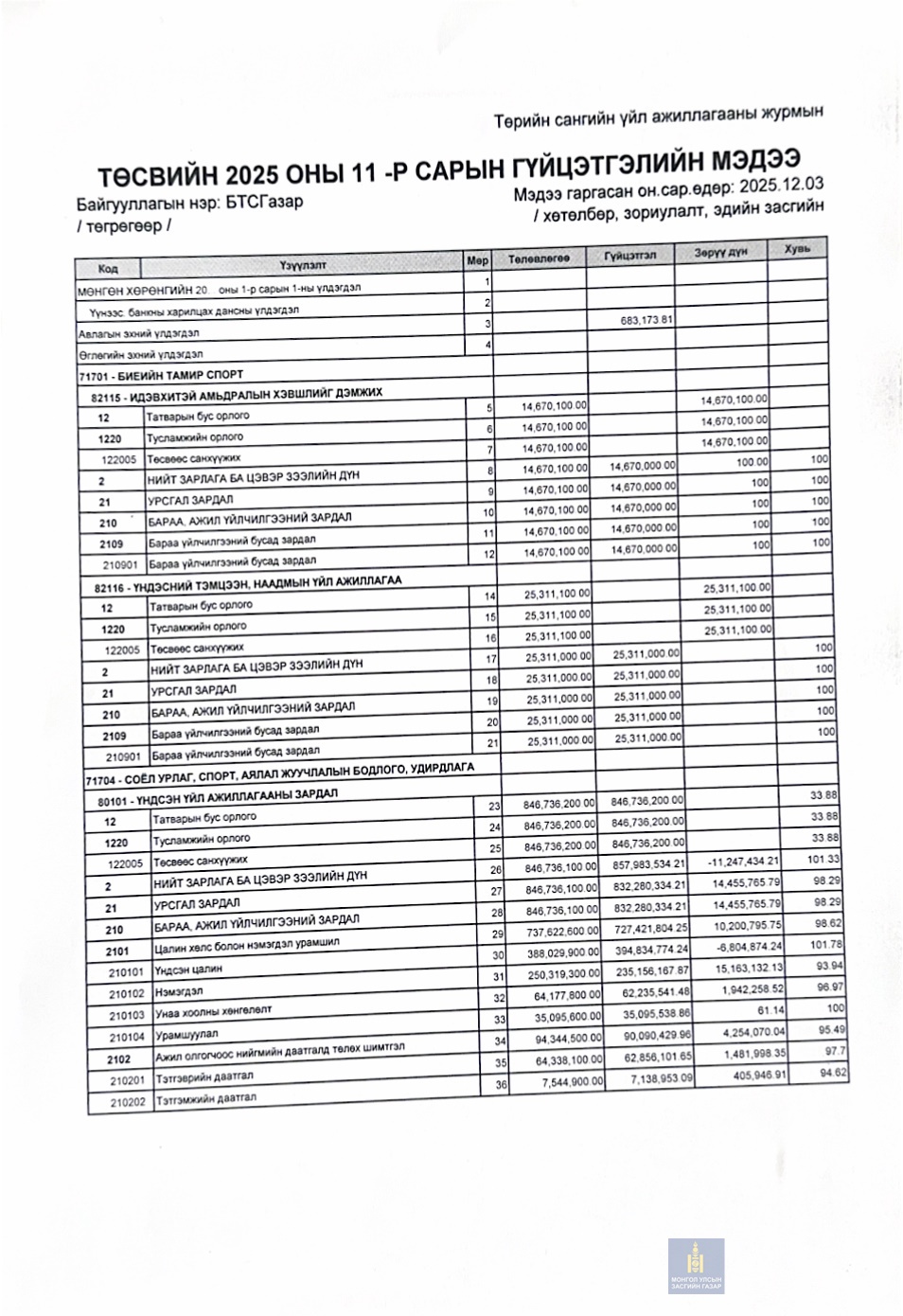 2025 оны 11-р сарын төсвийн гүйцэтгэлийн мэдээ.