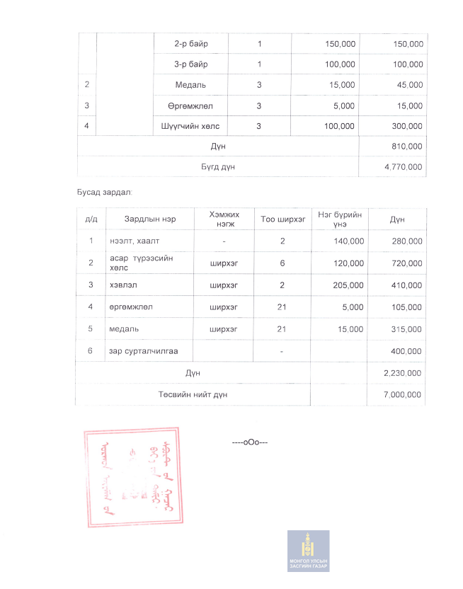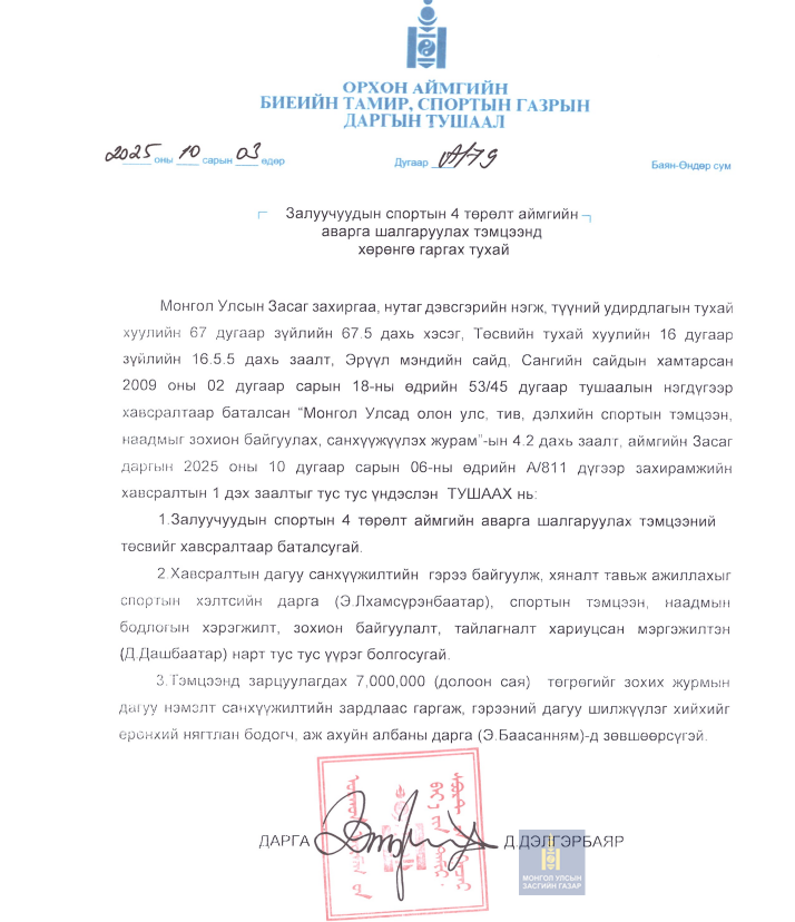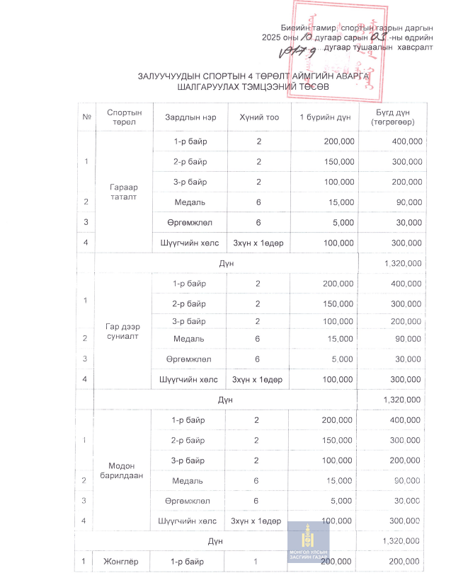 Дэлгэрэнгүй мэдээлэл авах эх сурвалж: Биеийн тамир, спортын газрын ерөнхий нягтлан Э.Баасанням