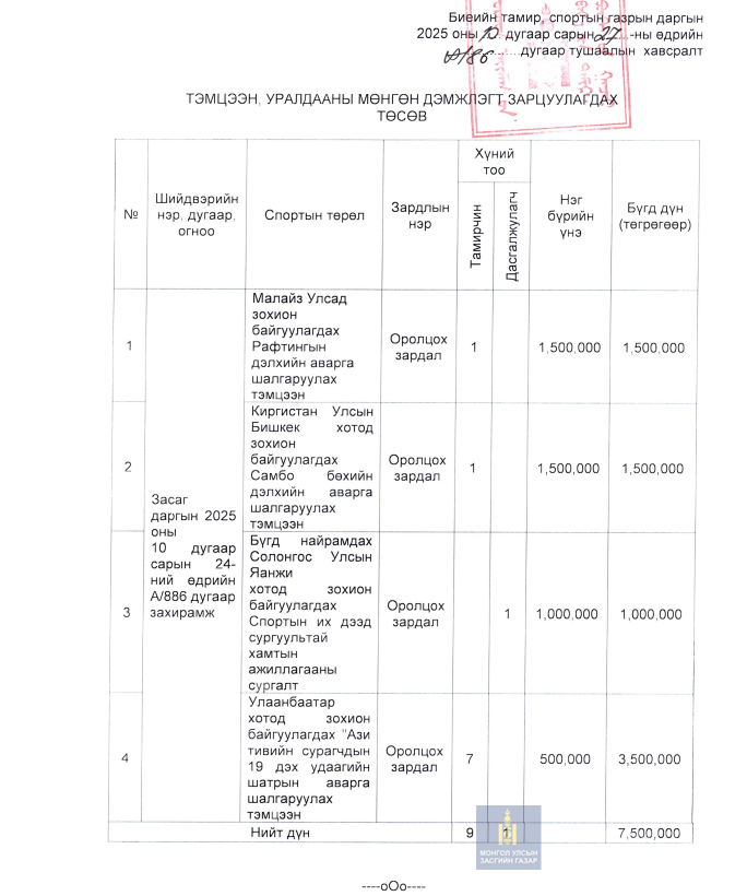 Дэлгэрэнгүй мэдээлэл авах эх сурвалж: Биеийн тамир, спортын газрын ерөнхий нягтлан Э.Баасанням