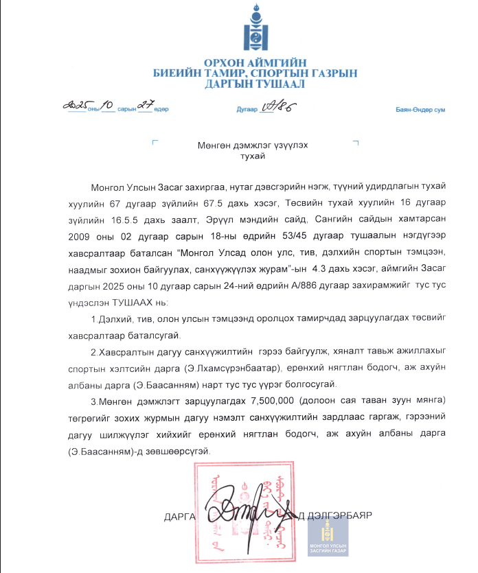 Утас: +976 77717777 И-мэйл: orkhon@sport.gov.mn
