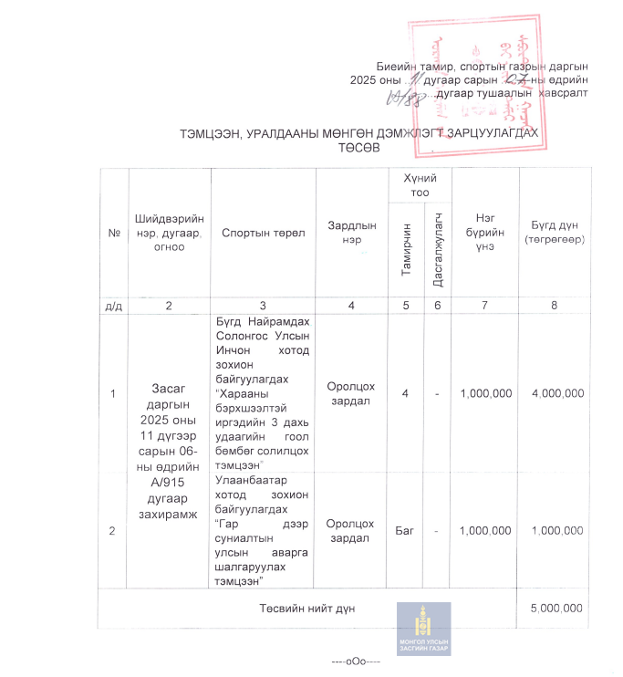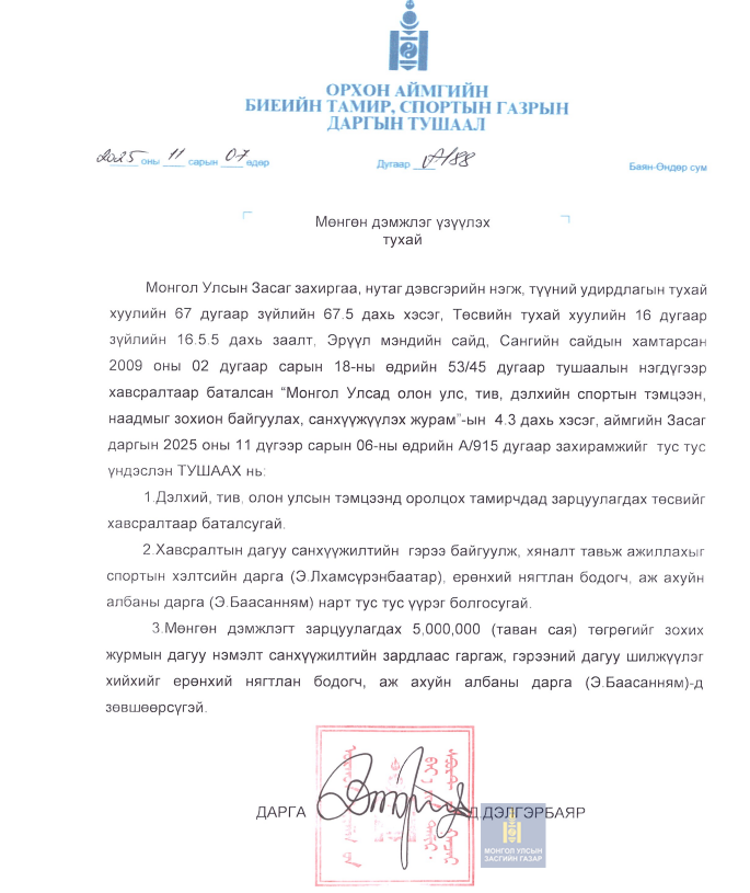 Дэлгэрэнгүй мэдээлэл авах эх сурвалж: Биеийн тамир, спортын газрын ерөнхий нягтлан Э.Баасанням