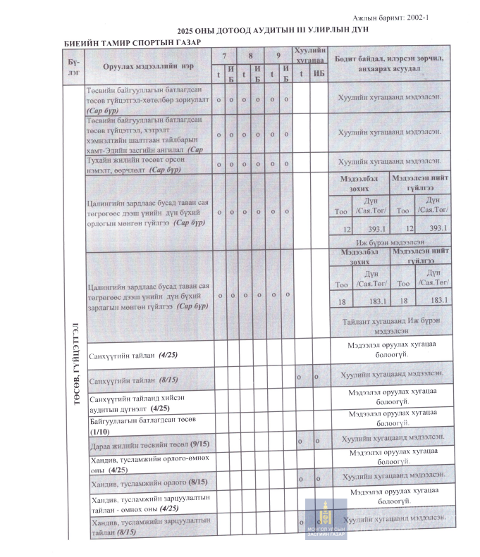 Дэлгэрэнгүй мэдээлэл авах эх сурвалж: Биеийн тамир, спортын газрын ерөнхий нягтлан Э.Баасанням