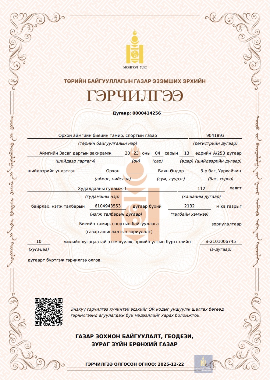 Биеийн тамир спортын газрын газар эзэмших эрхийн гэрчилгээ