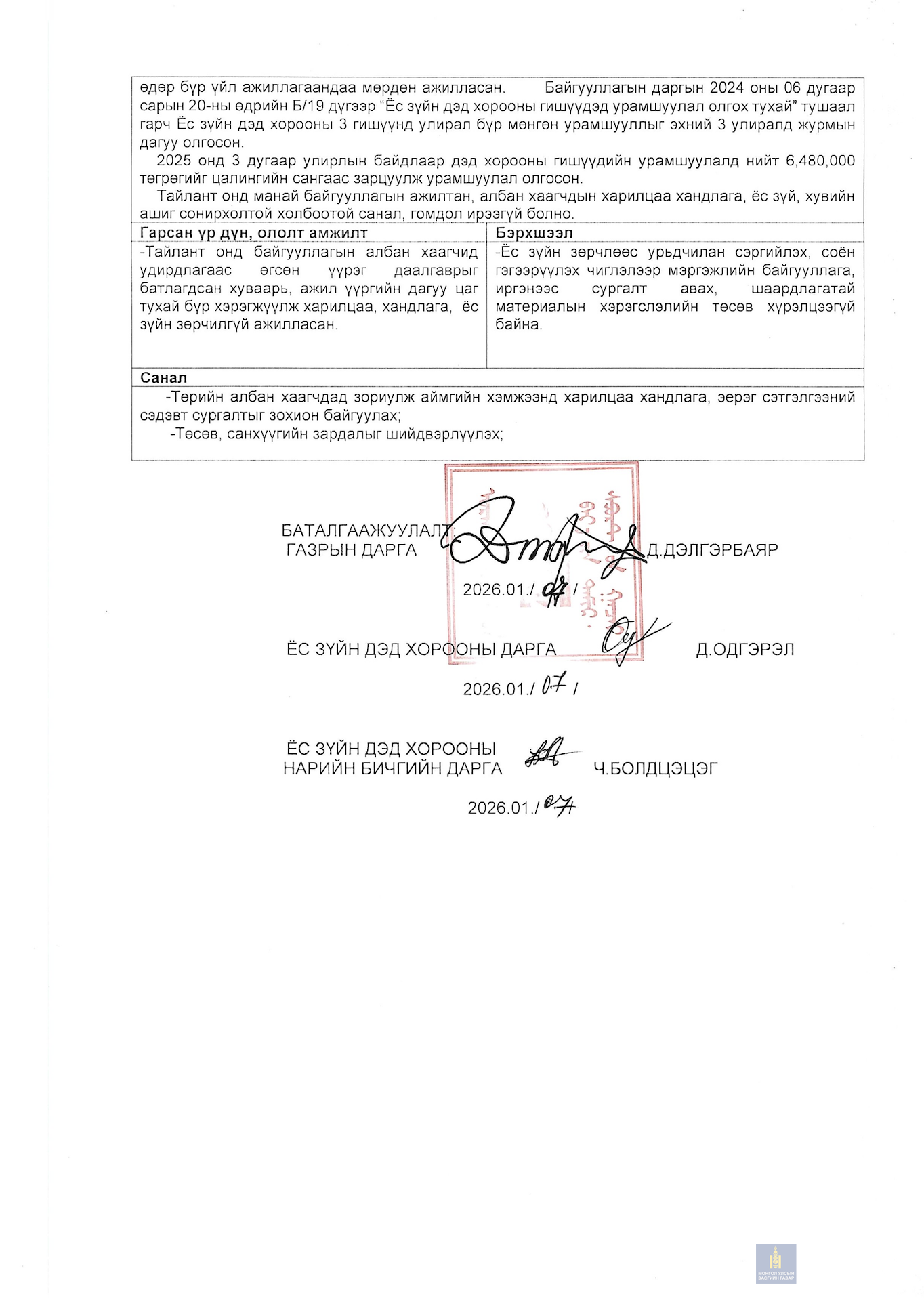 Байгууллагын үйл ажиллагаанд хяналт шинжилгээ хийсэн дүгнэлт