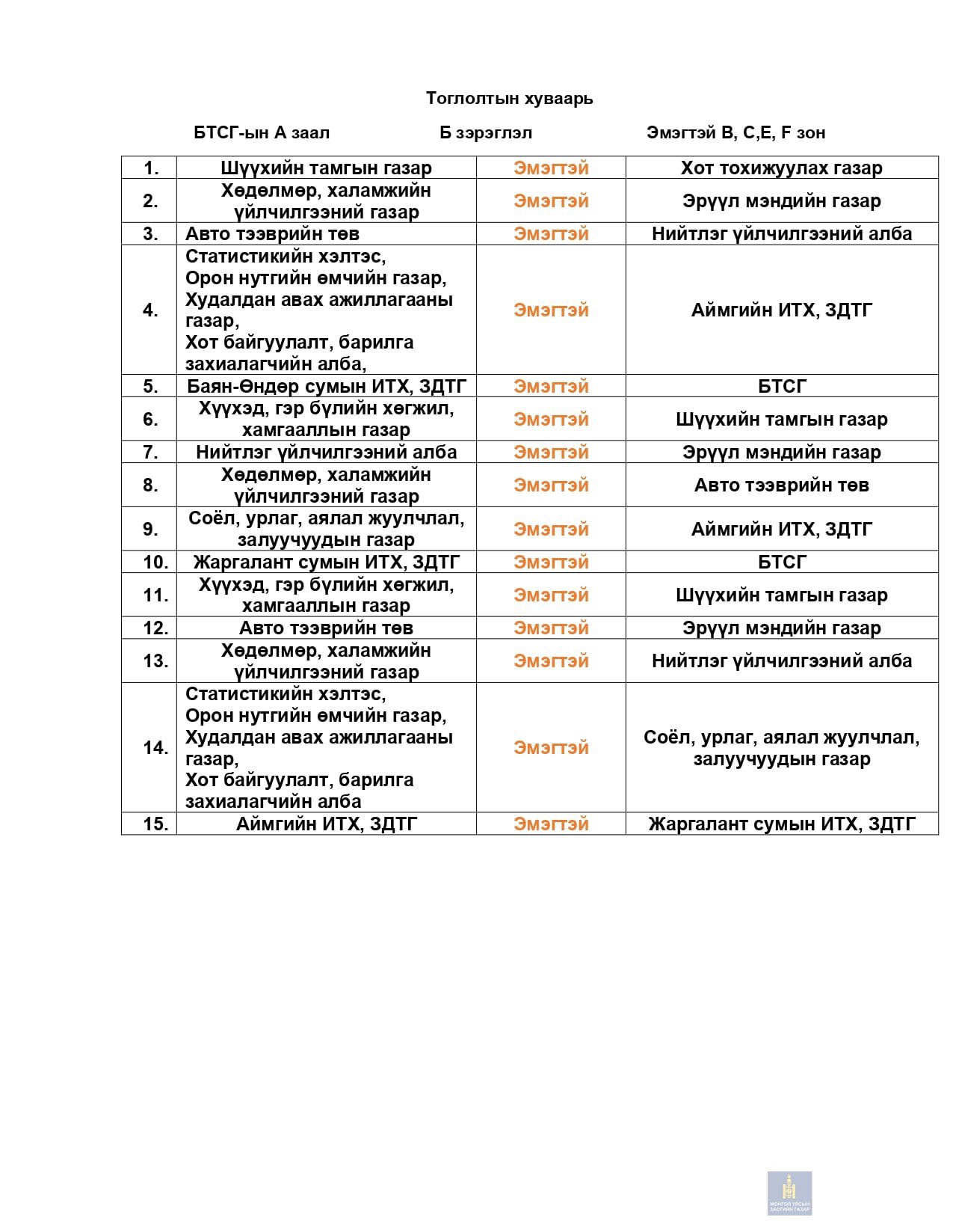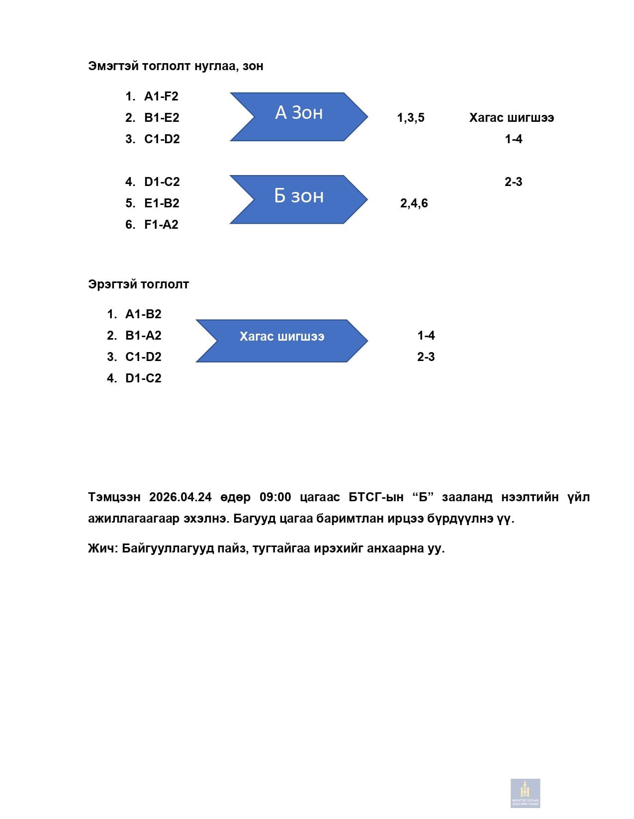Төрийн албан хаагчийн волейболын тэмцээний тоглолтын хуваарь