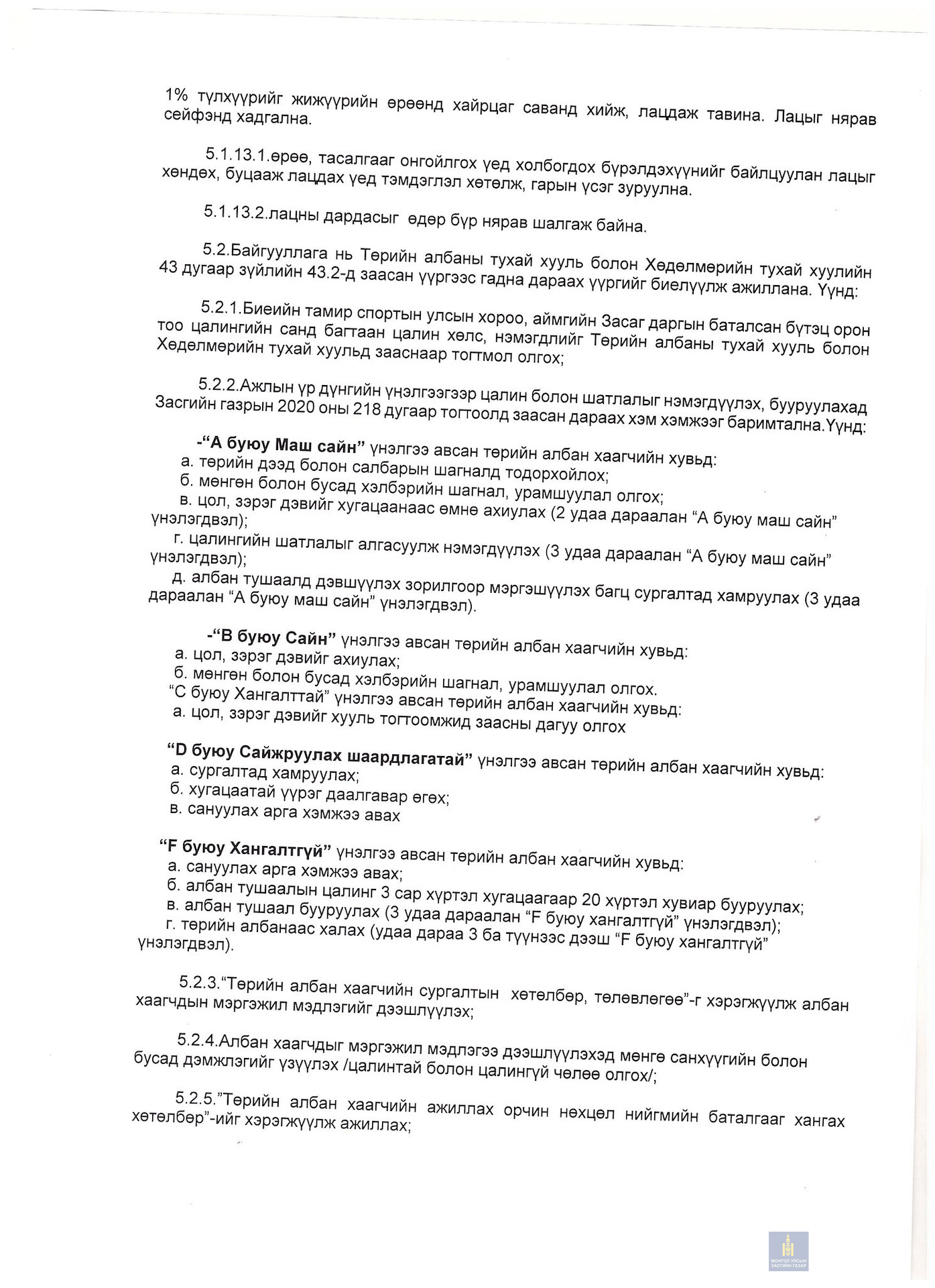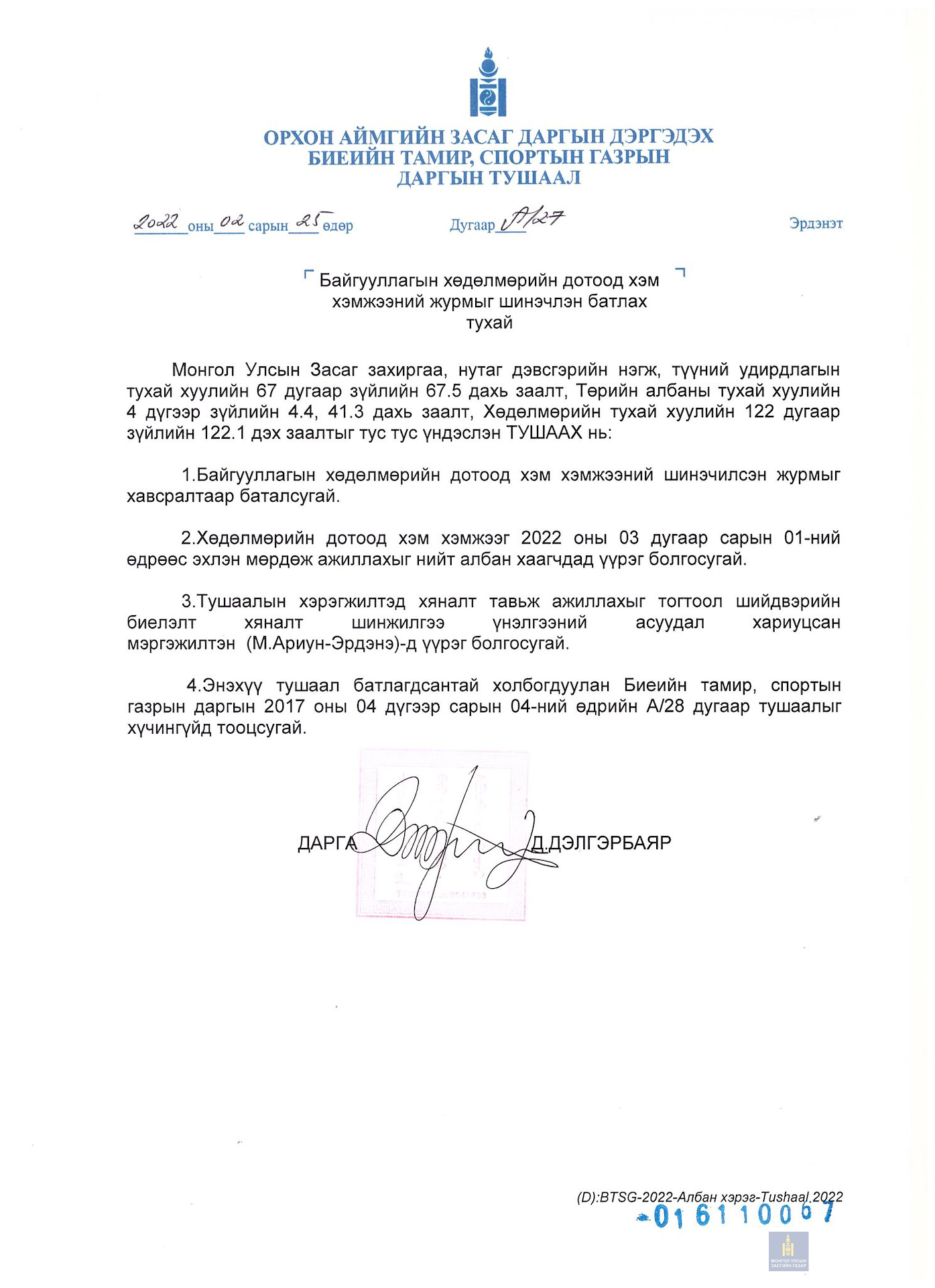 БИЕИЙН ТАМИР, СПОРТЫН ГАЗРЫН ДАРГЫН ТУШААЛ