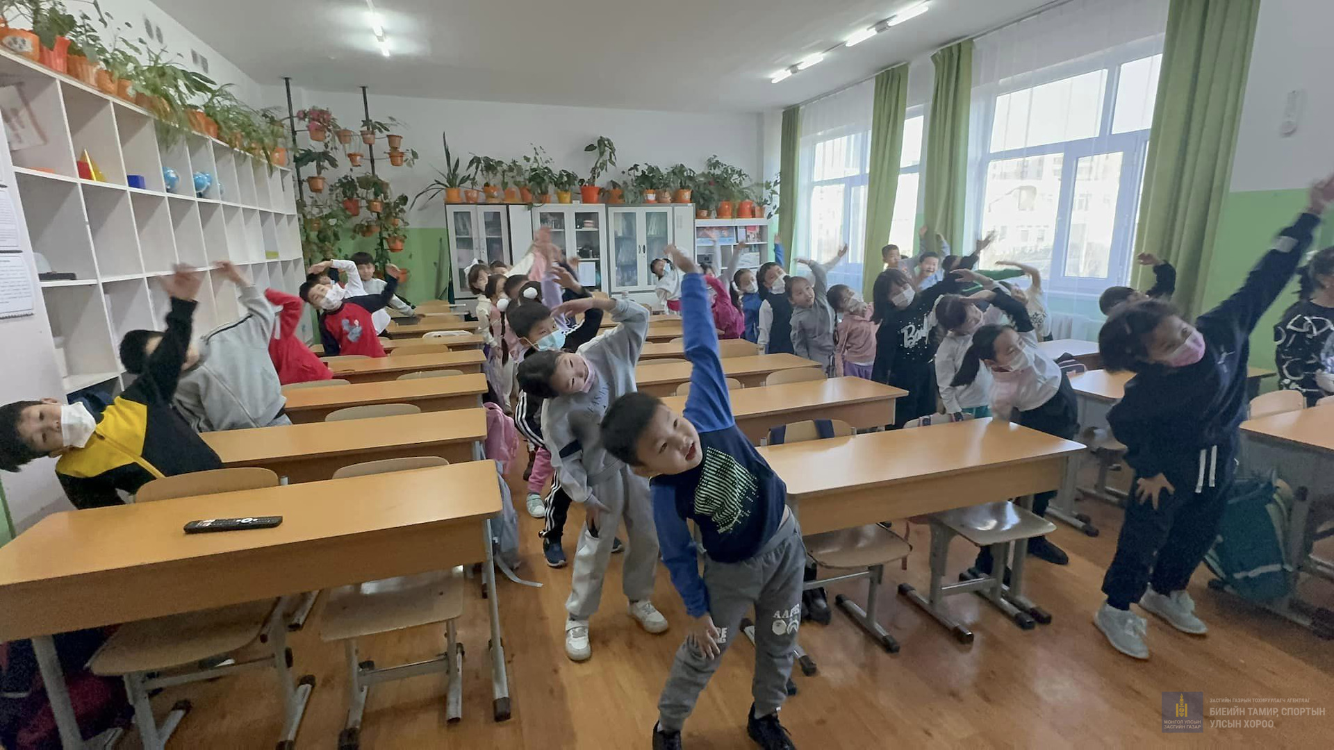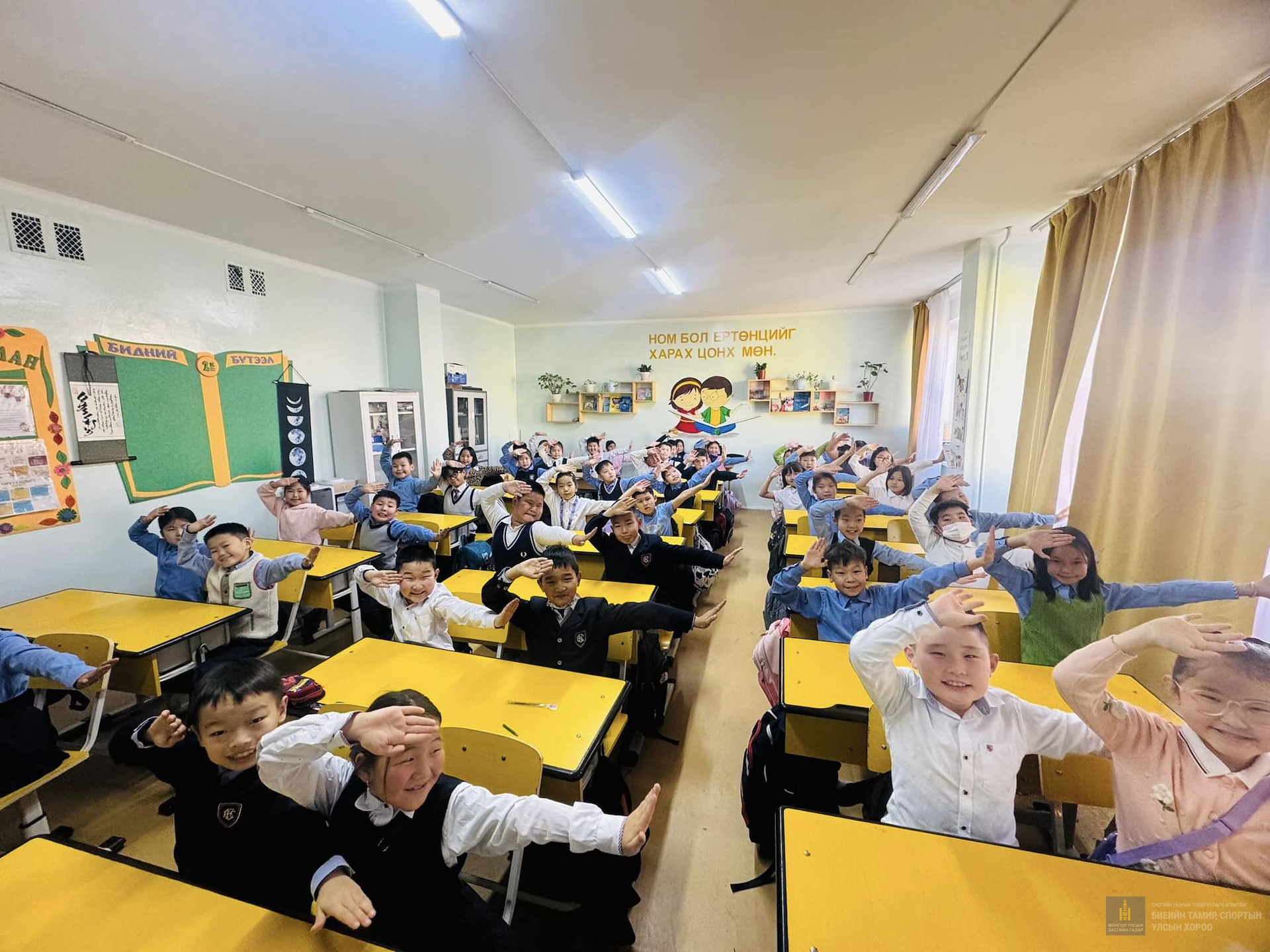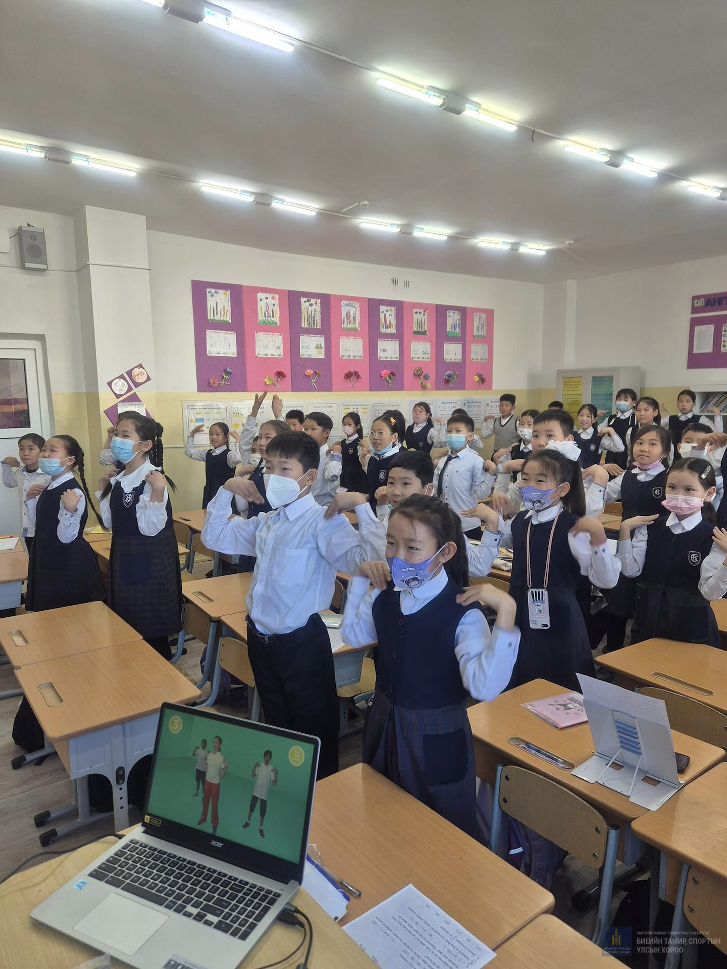 "Биеийн тамир, спортын бүтээлч сар 2024", "Хичээллэе-Өрнүүлье-Хэвшье" аяны хүрээнд ерөнхий боловсролын сургуулийн 2-5-р ангийн сурагчдын дунд "Нэг анги-Нэг өдөр" завсарлагааны дасгалын арга хэмжээг зохион байгуулж байна. Дасгалын арга хэмжээнд эхний 7 хоногт ерөнхий боловсролын 9