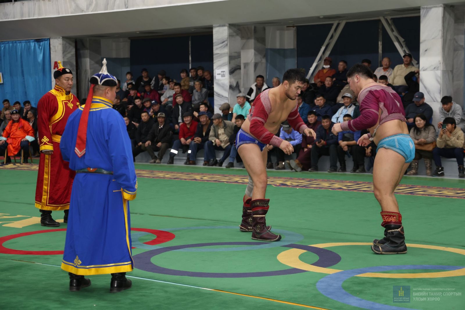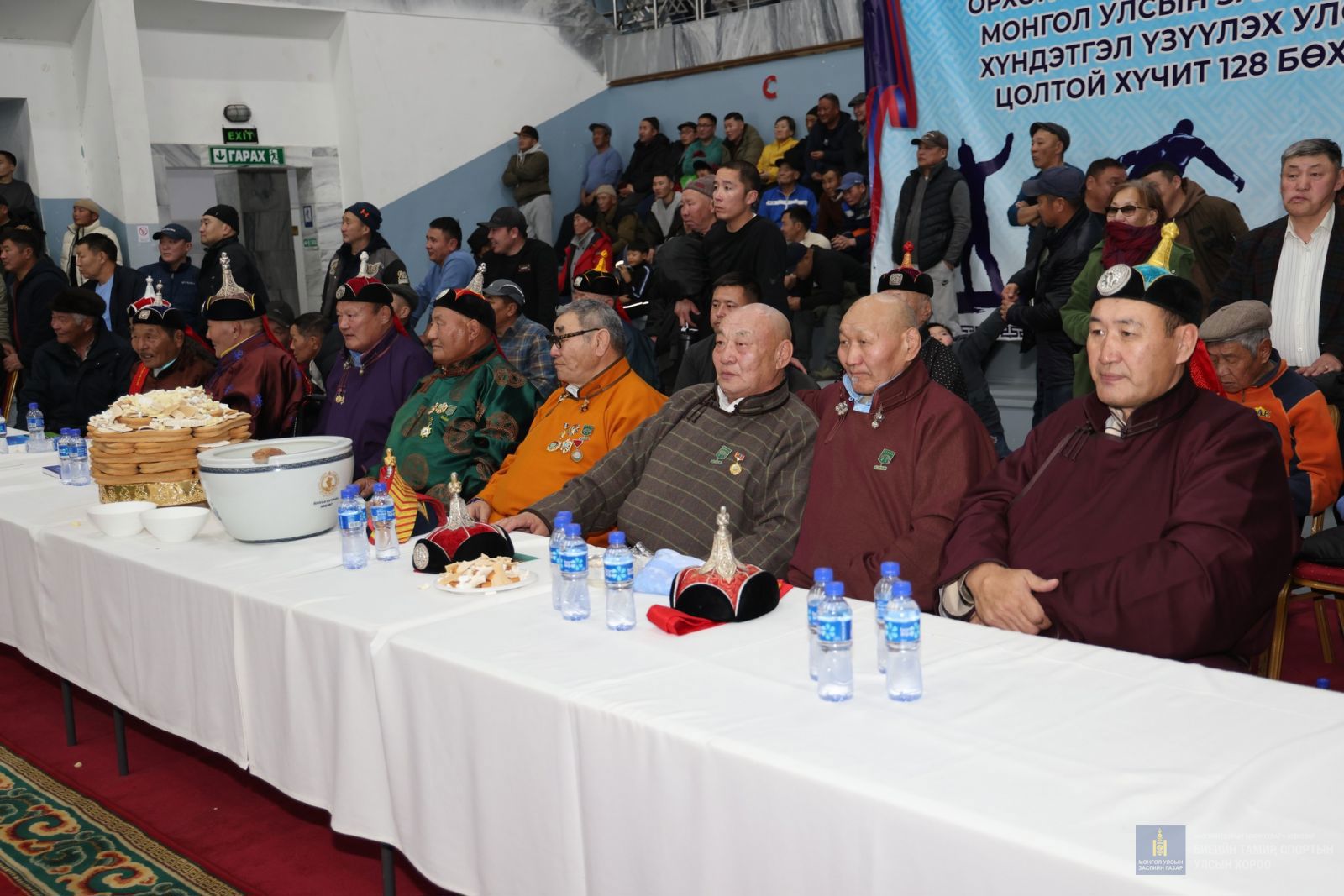 Монгол Улсын Заан цолтнуудад хүндэтгэл үзүүлэх барилдаанд улсын арслан Р.Пүрэвдавга, улсын заан Б.Батмөнх, С.Сүхбат, улсын харцага О.Мөнх-Эрдэнэ, улсын начин О.Амарсайхан тэргүүтэй улс, аймгийн алдар цолтой 128 бөх зодоглов.