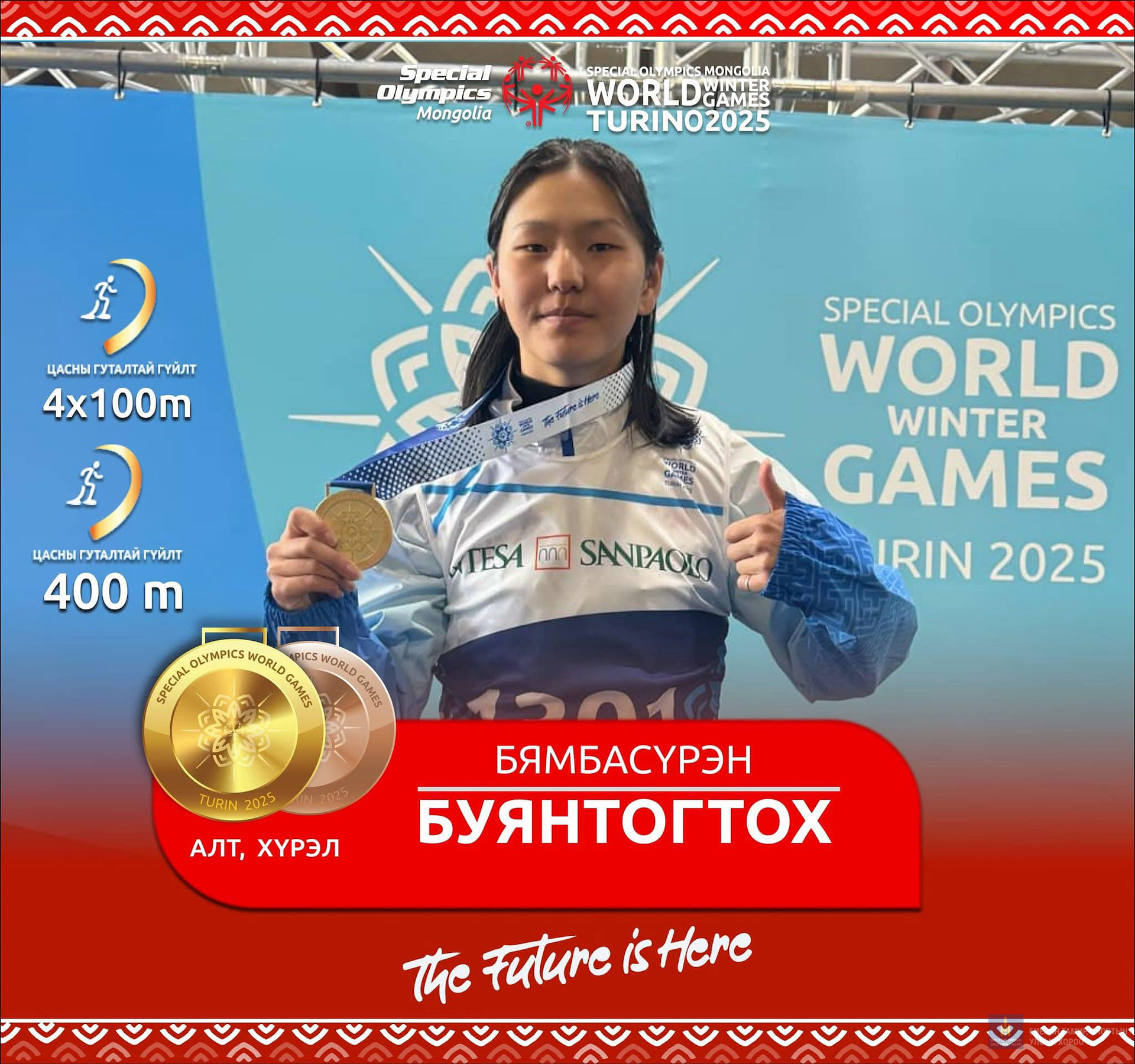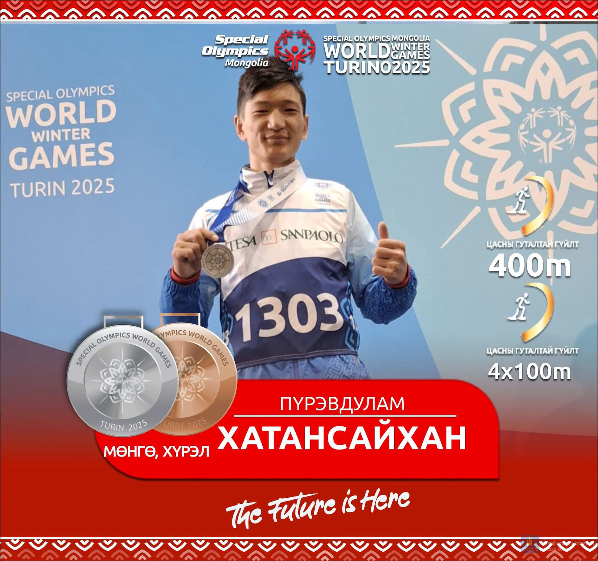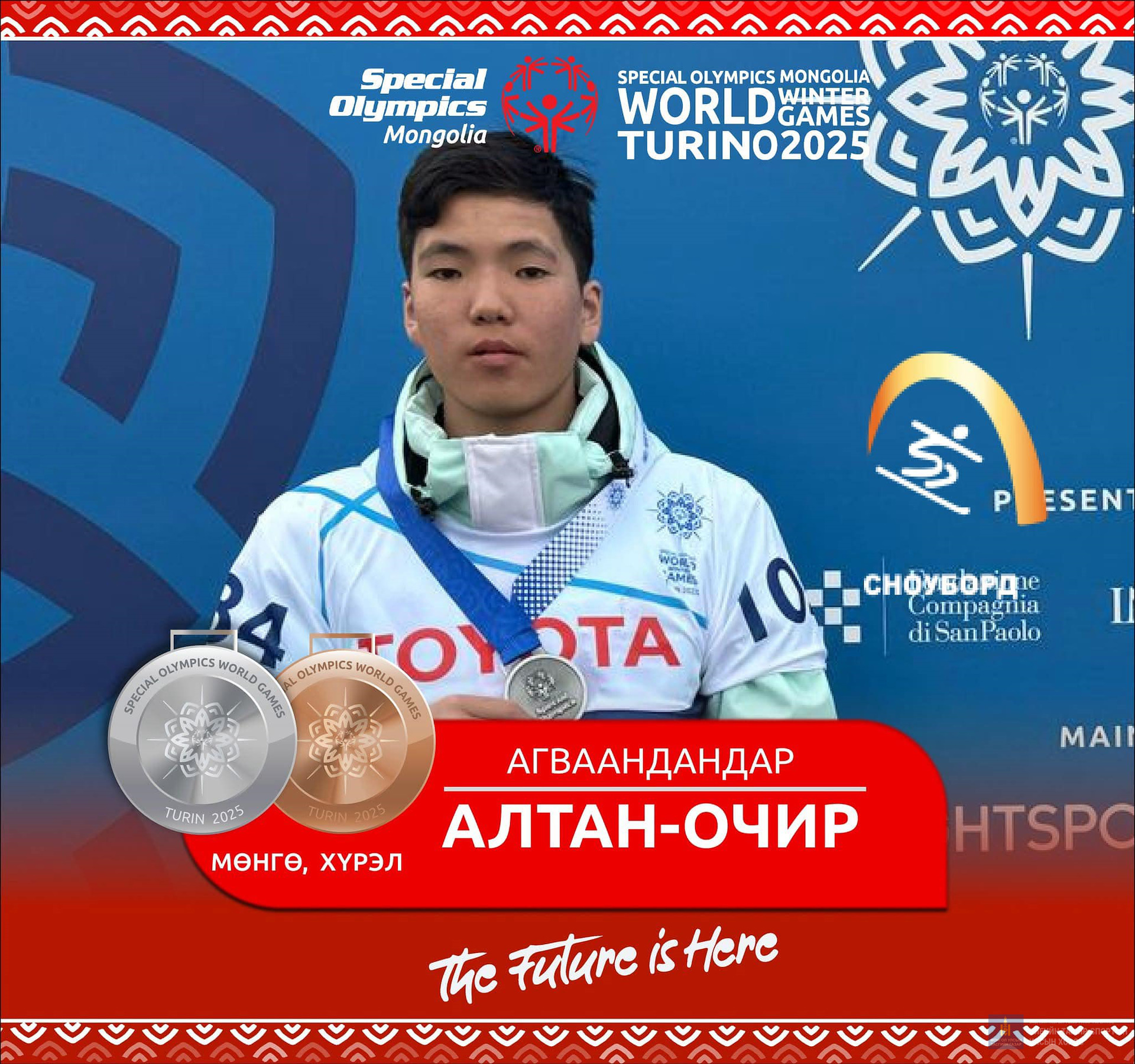 Харин Б.Бямба-Эрдэнэ цасны гуталтай 25 болон 50 метрийн зайн гүйлтийн төрөлд хошой мөнгөн медаль хүртсэн бол А.Азжаргал уулын цана, Б.Мөнх-Эрдэнэ бүжгийн ганцаарчилсан төрөлд, А.Алтан-Очир сноуборд, Ө.Елмырза цасны гуталтай 100 метрийн зайд, Б.Мөнх-Эрдэнэ, Я.Мягмарсүрэн нар бүжгийн хосын төрөлд, П.Хатансайхан цасны гуталтай 400 метрийн зайд, А.Идрээ цасны гуталтай гүйлтийн төрөлд мөнгөн медаль хүртлээ.