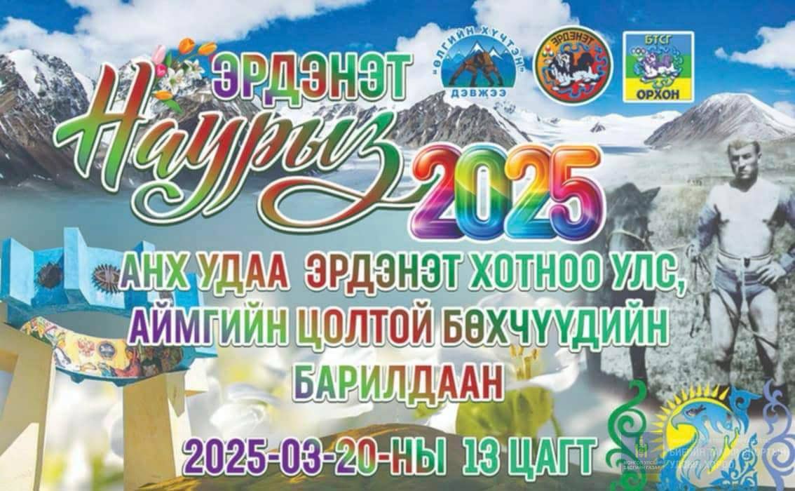 Орхон аймагт “ЭРДЭНЭТ НАУРЫЗ”-2025 Ул, аймаг, сумын цолтой хүчит 64 бөхийн барилдаан 2025.03.20-ны өдрийн 13.00 цагаас Биеийн тамир, спортын газрын Б зааланд зохион байгуулагдана.Барилдаанд Монгол улсын заан Б.Серик заан Өлгийн хүчтэн дэвжээний бөхчүүд оролцоно. Бөхчүүд бөх сонирхогчид та бүхнийг өргөнөөр хүрэлцэн ирэхийг урья. Түрүү бөх-3 сая, үзүүр бөх-2 сая, шөвгөрсөн бөхчүүд-1 сая төгрөгийн шагналтай.Бүртгэл цахимаар Batdorj Tuvaan гэсэн хаягаар хийлгээрэй.