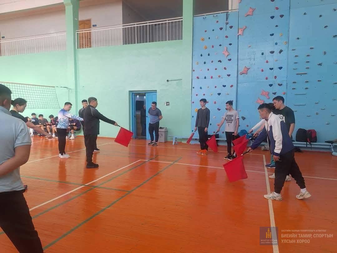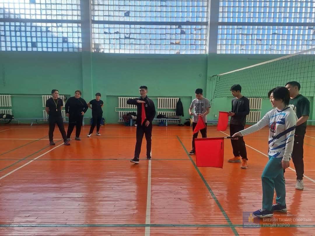 Сургалтанд хамрагдсан хүмүүсээс "Орхон аймгийн насанд хүрэгчдийн волейболын аварга шалгаруулах тэмцээн"-д туслах шүүгчээр ажиллан дадлага хийж байна.